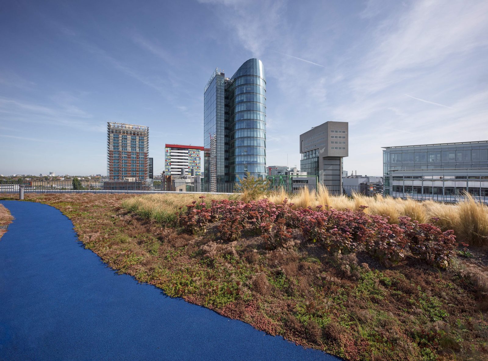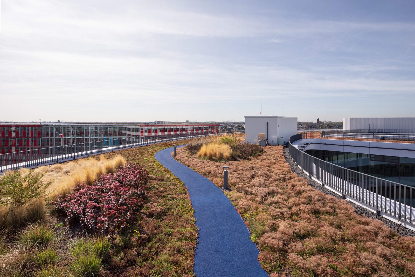 Highlight der 10.000 m² nutzbaren Außenfläche ist die blaue, geradezu mäandrierende Joggingstrecke auf der bepflanzten Dachlandschaft mit Blick über den Hafen. Der Bezug zum naheliegenden Wasser wird auch in den ebenerdigen Außenanlagen des Gebäudekomplexes hergestellt. Ein dynamisches Wasserband mit Schilfsaum entlang der Außenterrasse gliedert den Raum und schafft eine stimmungsvolle Atmosphäre für die Pause.