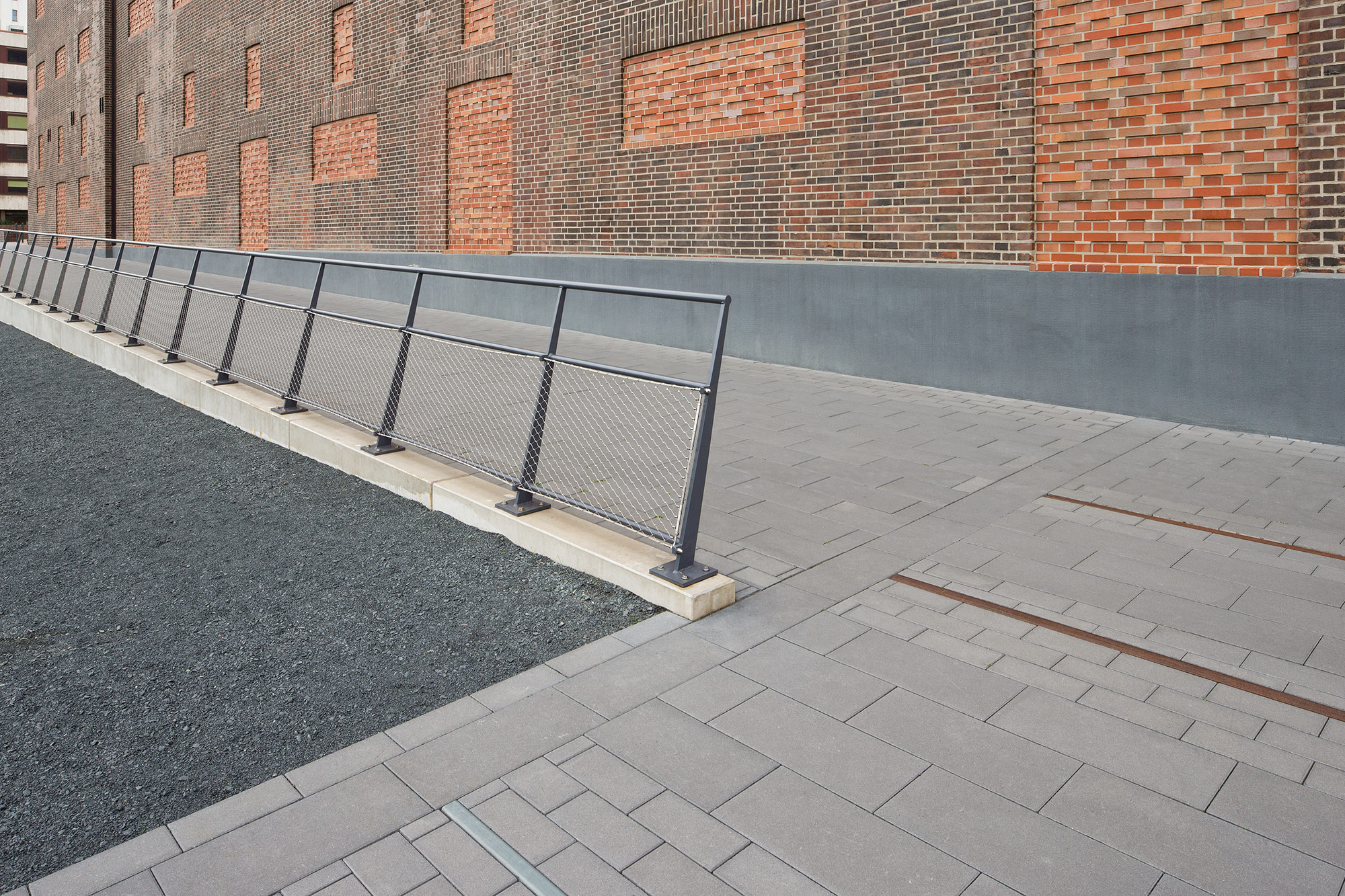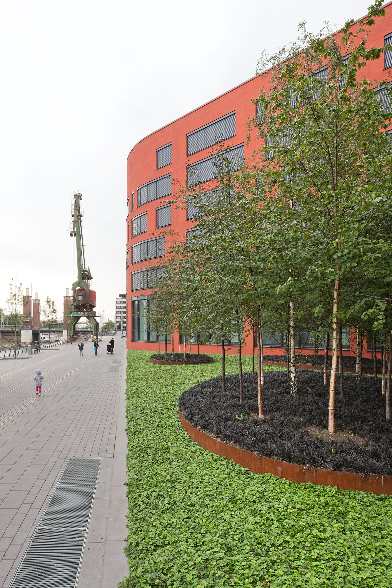 Historische Spuren wie Kräne und Schienenstränge wurden in die Neugestaltung integriert, das Gedächtnis der ehemaligen industriellen Nutzung bleibt somit erhalten und prägt auch zukünftig das Bild der Promenade.
