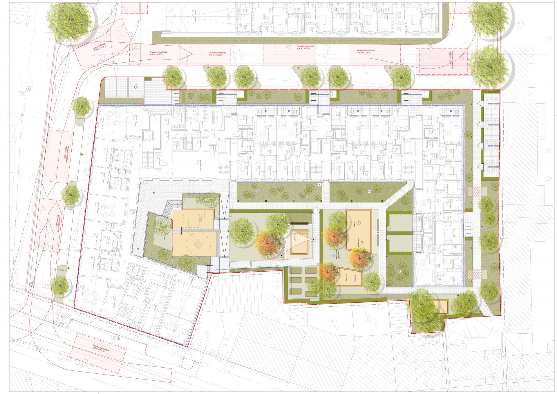 Gemeinschaftsgrünflächen werden mit einer artenreichen Stauden- / Gräsermischung und Solitärsträuchern bepflanzt. Im Nordflügel erhalten die EG-Wohnungen auf der Südseite einen kleinen Garten mit einer Einfriedung aus geschnittenen Laubgehölzhecken. Der nördliche Teil des Innenhofes ist zu großen Teilen Kinderspielfläche, die auch der Öffentlichkeit zur Verfügung steht. Hier werden Sandspielflächen und Spielgeräte mit den erforderlichen Sicherheitsräumen zur Verfügung stehen. Ein Wegenetz erschließt die rückwärtig gelegenen Zugänge zum Treppenhauskernen im Gebäude.