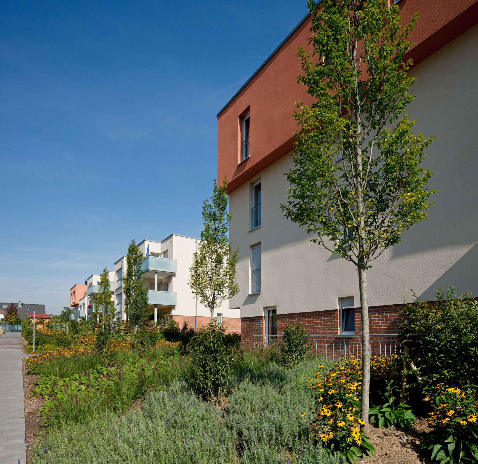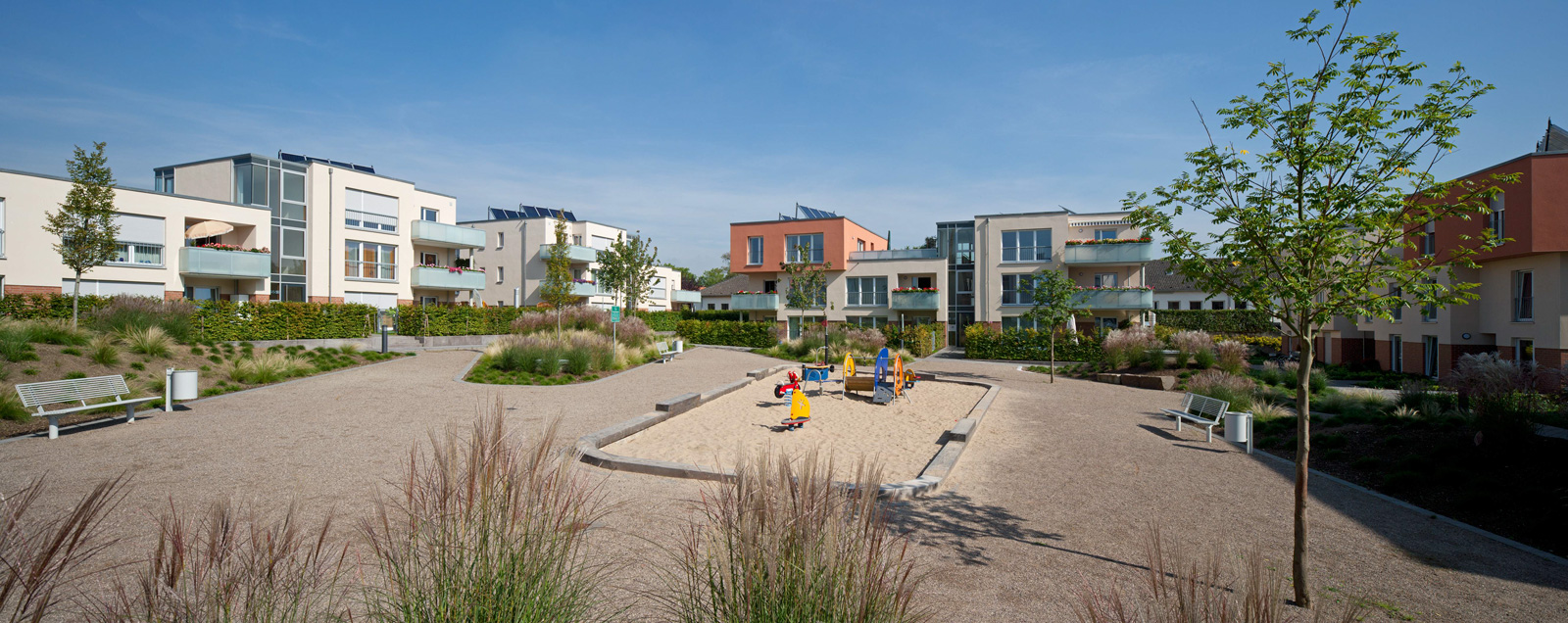 Miet-Reihenhäuser mit eigenem Garten und Mehrfamilienhäuser mit Sondernutzungsflächen sind die bevorzugten Wohnformen. Ergänzt wird dies durch eine abwechslungsreiche Freiraumstruktur mit differenzierten Angeboten für alle Bewohner.