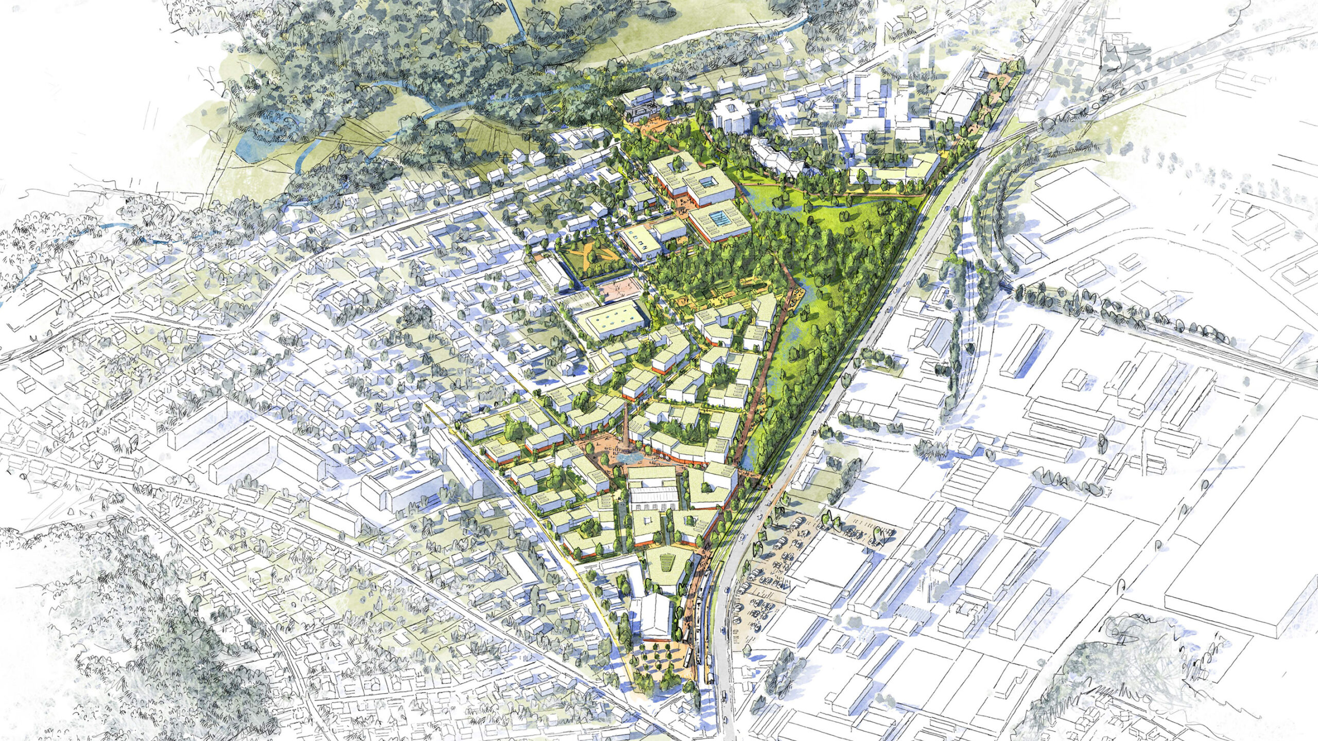 Das Mischgebiet (MI) ist mit einer Tiefgarage unterbaut. Auf der Tiefgaragendecke wird eine Baum- mit einer Staudenpflanzung als Hochbeet ausgeführt. Für die Dachflächen ist eine extensive Dachbegrünung vorgesehen.
