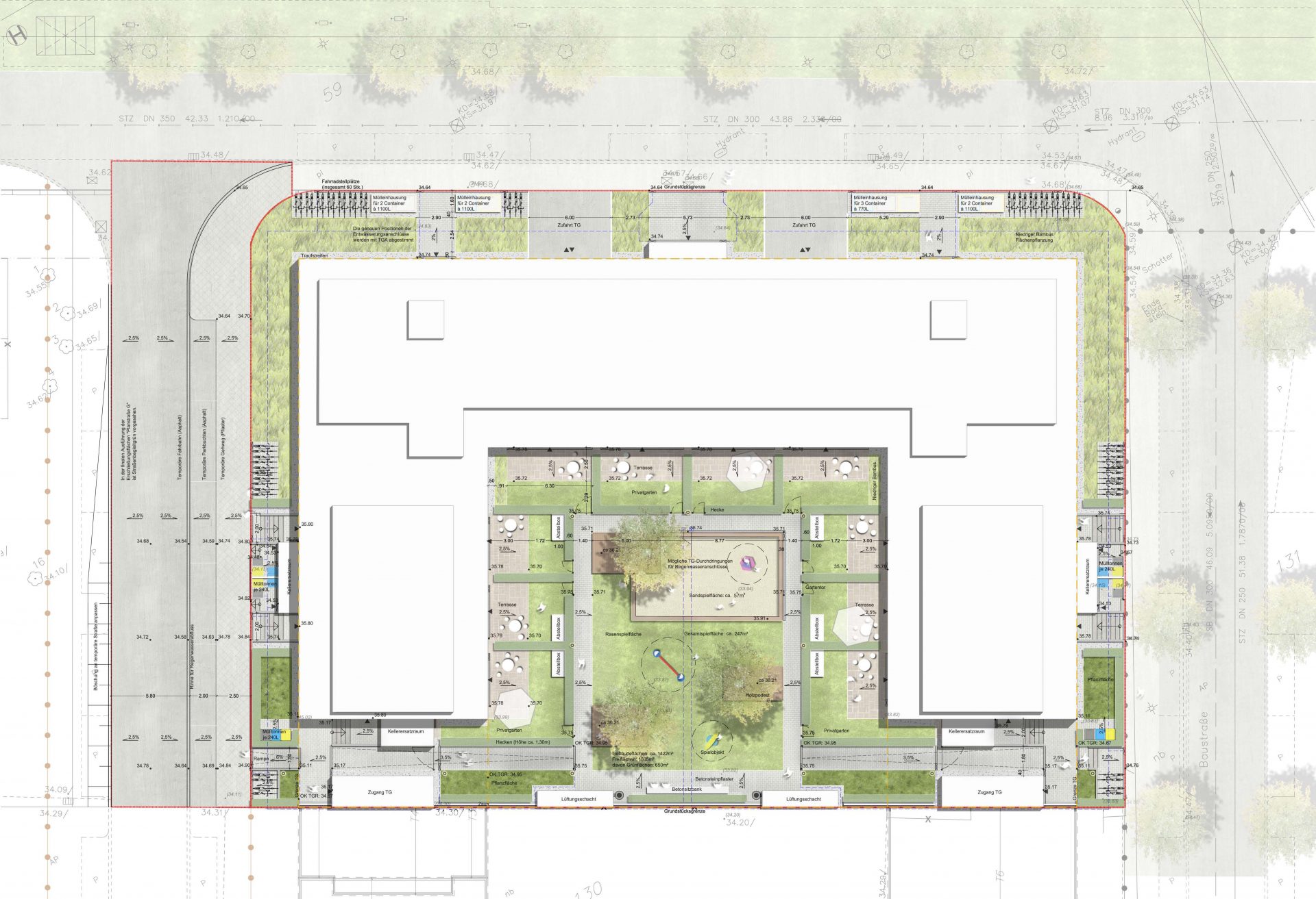 Im inneren Bereich sind private und gemeinschaftlich nutzbare Grün- und Spielflächen vorgesehen. Die Gesamtspielfläche beträgt ca. 247 m² wovon ca. 57 m² als Sandspielfläche ausgebildet werden. In den Sand- und Rasenflächen werden insgesamt drei Spielgeräte aufgestellt. Drei neue Bäume sind in Hochbeeten vorgesehen, die jeweils mit einem Holzpodest zum Sitzen und Spielen verkleidet werden. Eine weitere Sitzgelegenheit wird in Form einer Betonbank mit Holzauflage an der südlichen Grundstücksgrenze vorgesehen. Pflanzflächen und Hecken Bilden die Abgrenzung zum im Süden angrenzenden Nachbargrundstück.