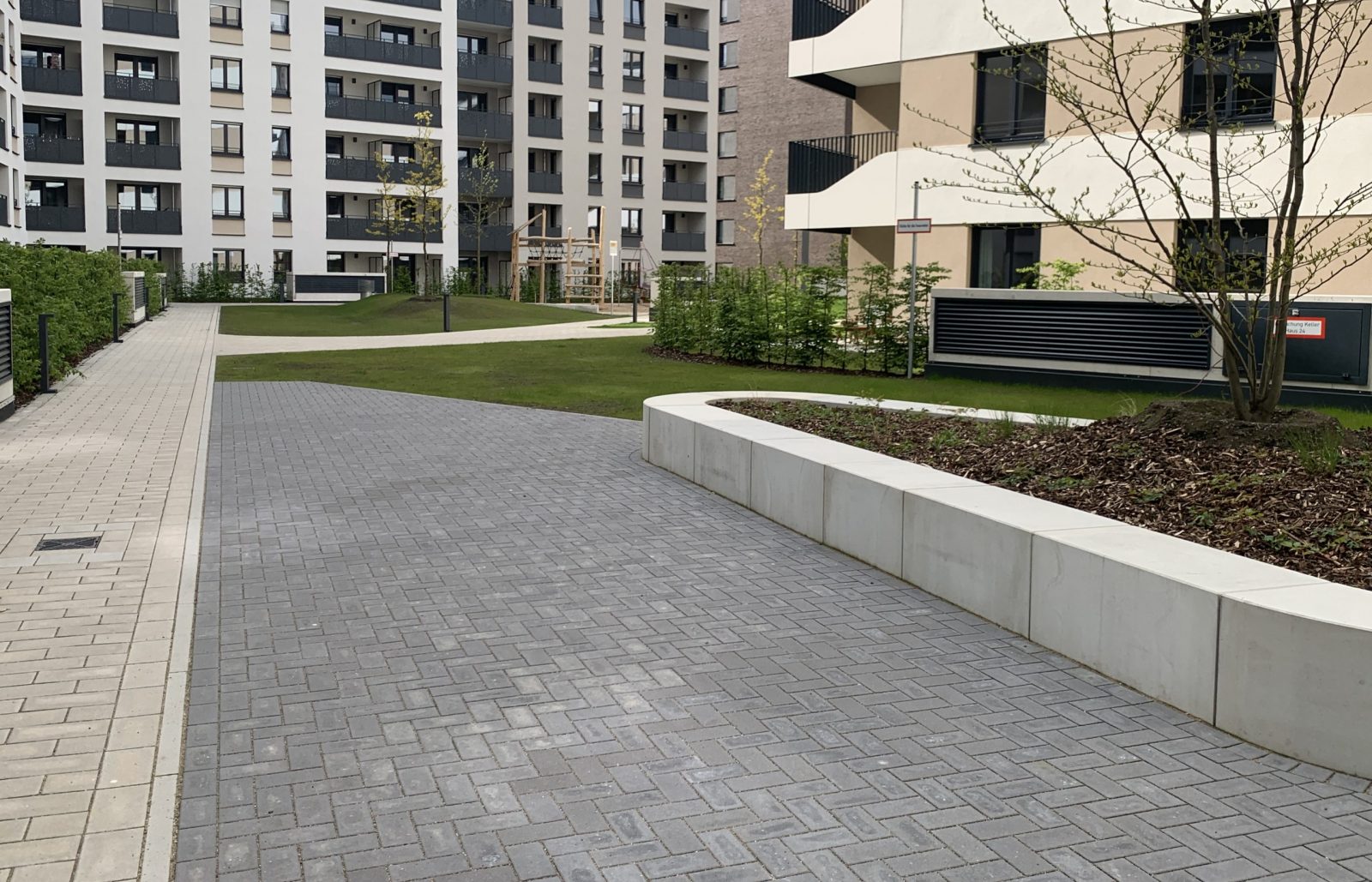 Die Blockrandbebauung des Projekts umfasst einen Innenhof mit begrüntem Charakter, der komplett mit einer Tiefgarage unterbaut ist. Die Tiefgaragendecke wird wurzelfest abgedichtet und mit einer funktionsfähigen Drainschicht abgedeckt. Das Gelände wird teilweise modelliert, um an den Baumstandorten einen ausreichenden Aufbau zu gewähren. Hier werden standortgerechte Bäume, die in den unterschiedlichen Jahreszeiten attraktive Aspekte aufweisen, wie Felsenbirne, Lederhülsenbaum, Platane und Linde in Sorten gepflanzt.
