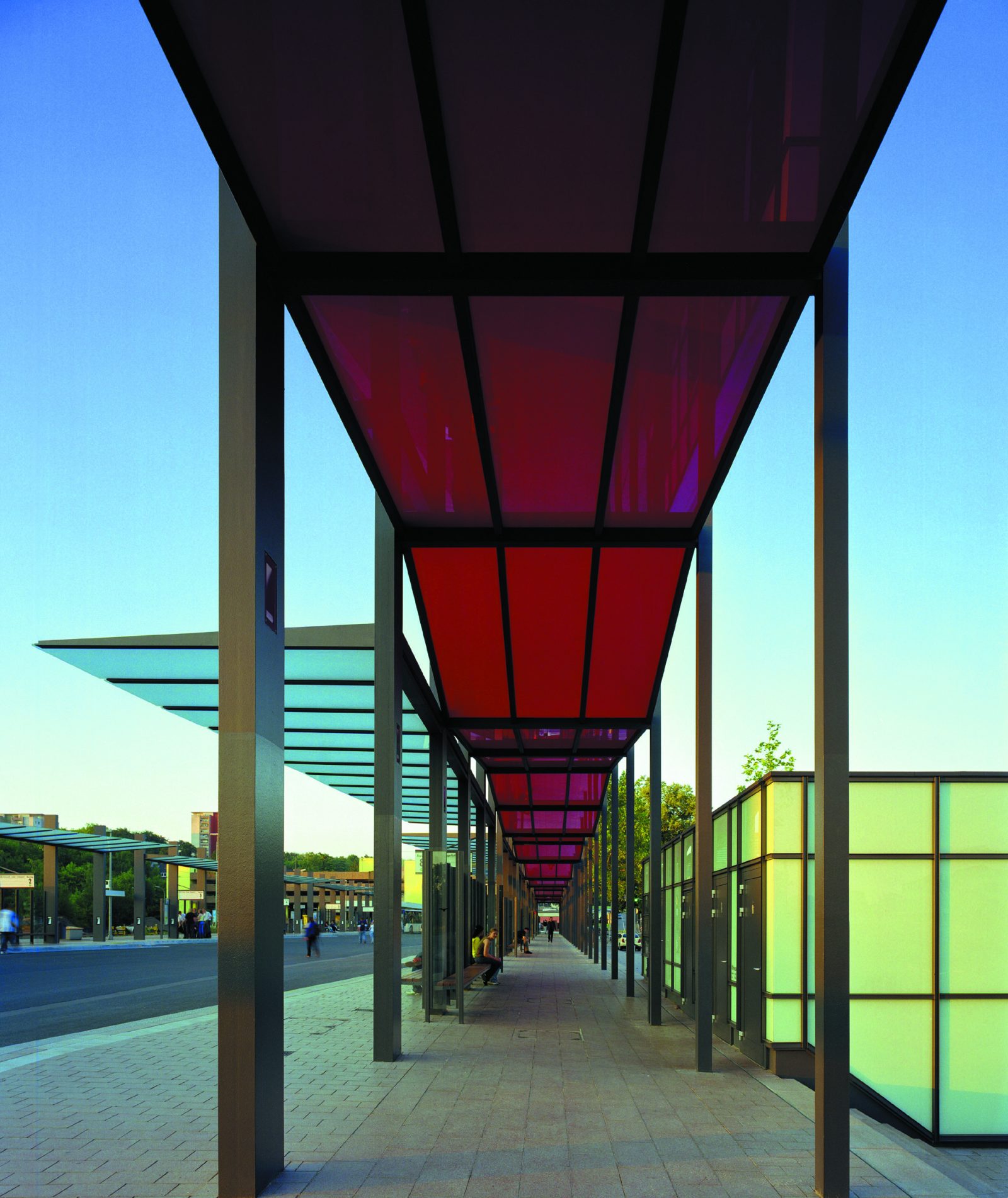 Entlang der Pergola und des gegenüberliegenden S-Bahndaches überdecken diagonale Glasdächer die An- und Abfahrtzonen der Busse. Die schräge Form gewährleistet eine optimale Befahrung und Bewegungsdynamik. Die Dynamik in Funktion und Form ist durch eine Lichtinszenierung des „bewegten Baldachins“ auch bei Nacht erkennbar.