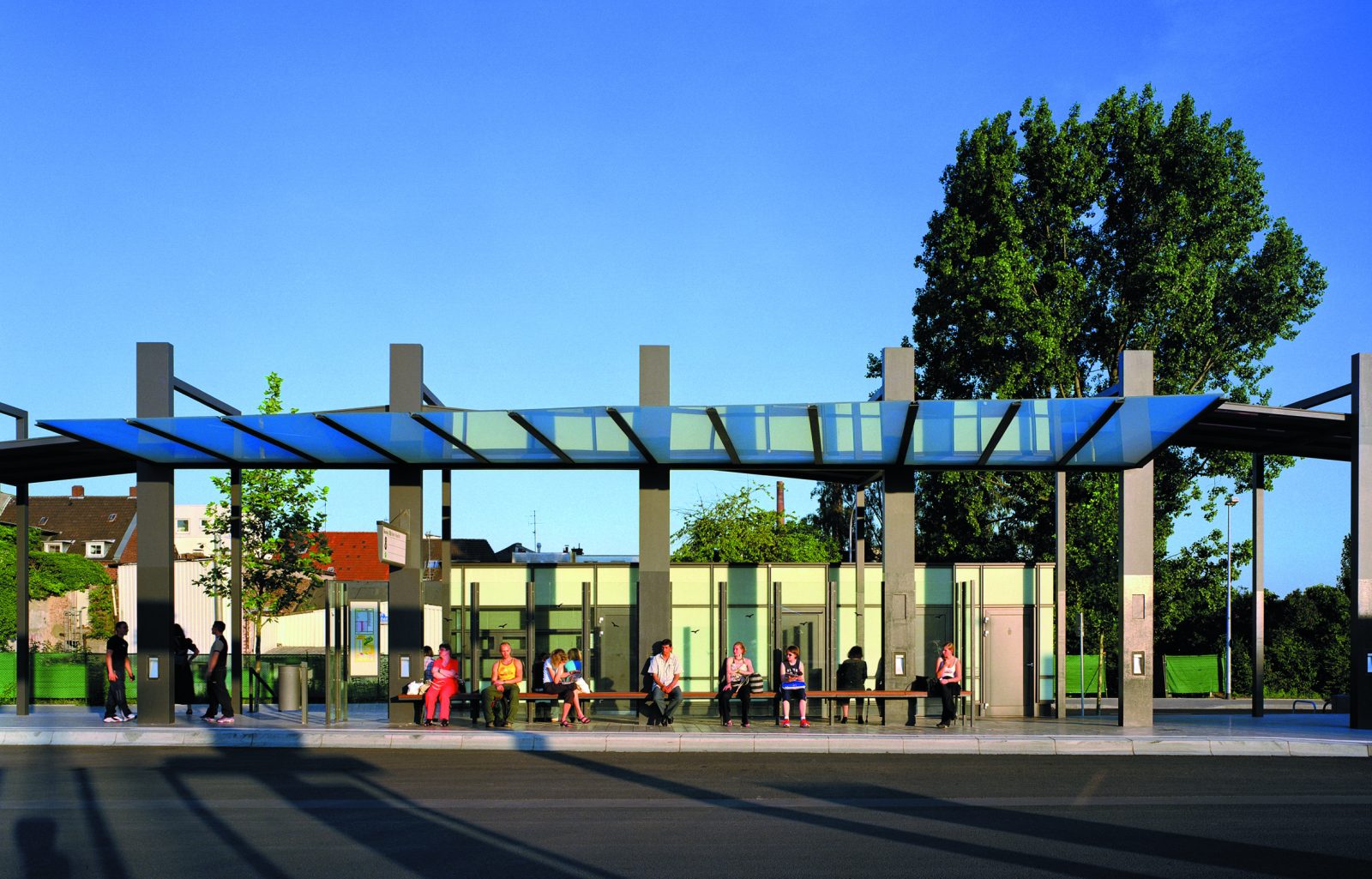 Prägend für das Stadtbild ist eine lineare Pergola. Diese verbindet den Stadtplatz mit dem ZOB und der Aufstellfläche der Busse. Durch die offene Stahlkonstruktion zieht sich in leichtem Auf und Ab, ähnlich eines bewegten Baldachins, ein farbiges Glasdach. Vertikale Glaselemente schützen die Fahrgäste vor Wind und Wetter. Weiterhin sind hier Boxen mit Aufenthaltsbereichen für die Fahrer, Fahrkartenautomaten und öffentlichen Toiletten integriert.