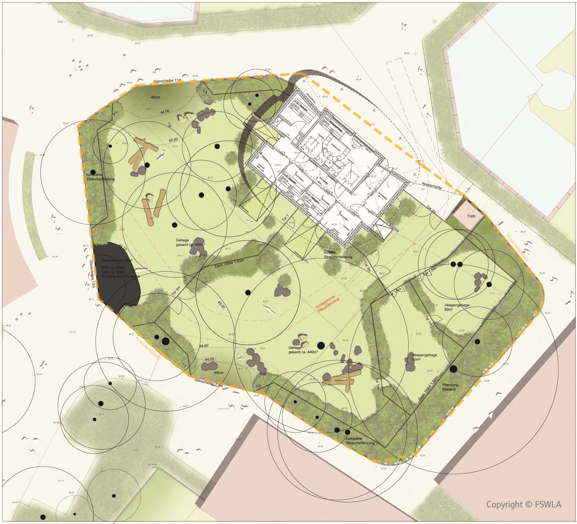 Für die winterlichen Unterbringung der Tiere und die Versorgung des Geheges wird ein Stallgebäude im Norden der Anlage errichtet. Mittels natürlichem Fassadenmaterial und einem Gründach fügt sich das Gebäude nahtlos in die natürliche Umgebung ein.