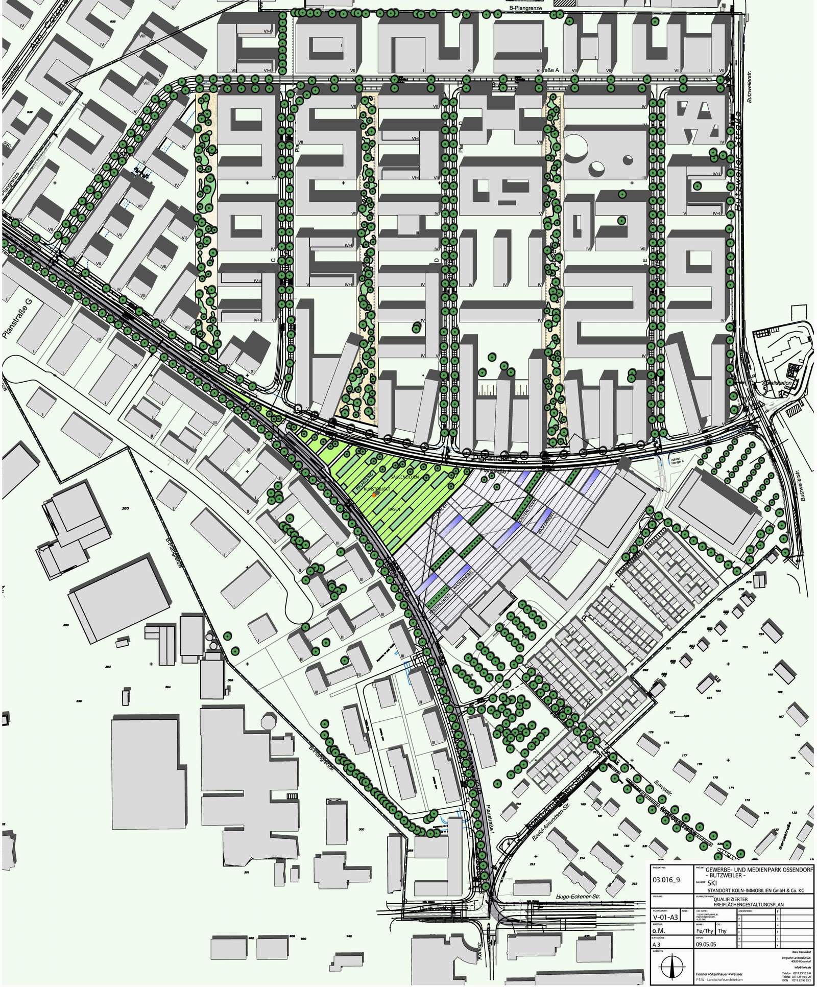 Die künftige städtebauliche Entwicklung der Konversionsfläche, die als Nutzung überwiegend büro- und dienstleistungsorientiertes Gewerbe und Wohnen unter Erhalt und Einbindung der unter Denkmalschutz stehenden Gebäude und Flächen vorsieht, orientiert sich an dem Entwurf von Goerdt + Schwarz als Siegerin des städtebaulichen Wettbewerbs (2003).