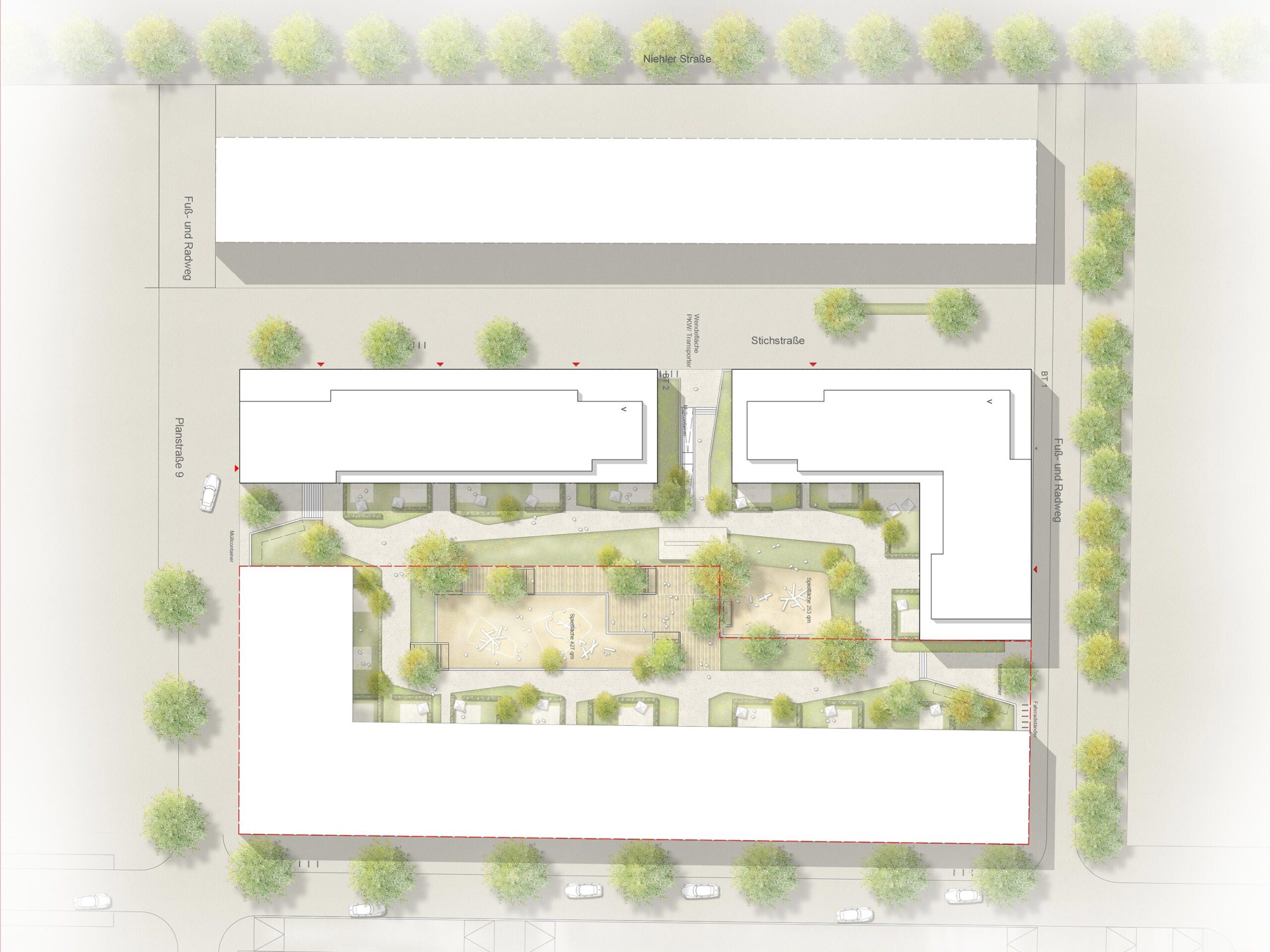 Intention der Entwurfsverfasser ist es, einen qualitätvollen „Zwischenraum“ zu gestalten, in dem sich die Grenzen von privat und öffentlich als fließende Übergänge ergeben.