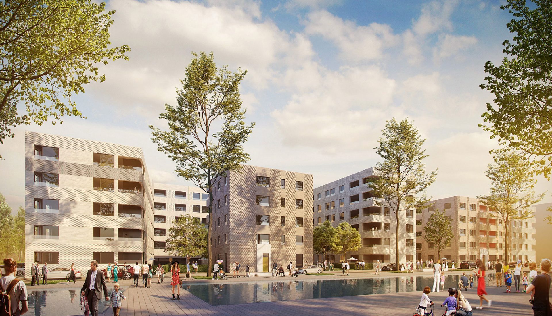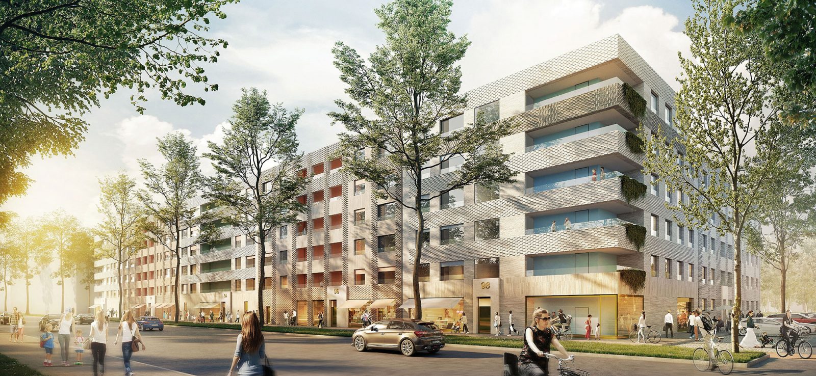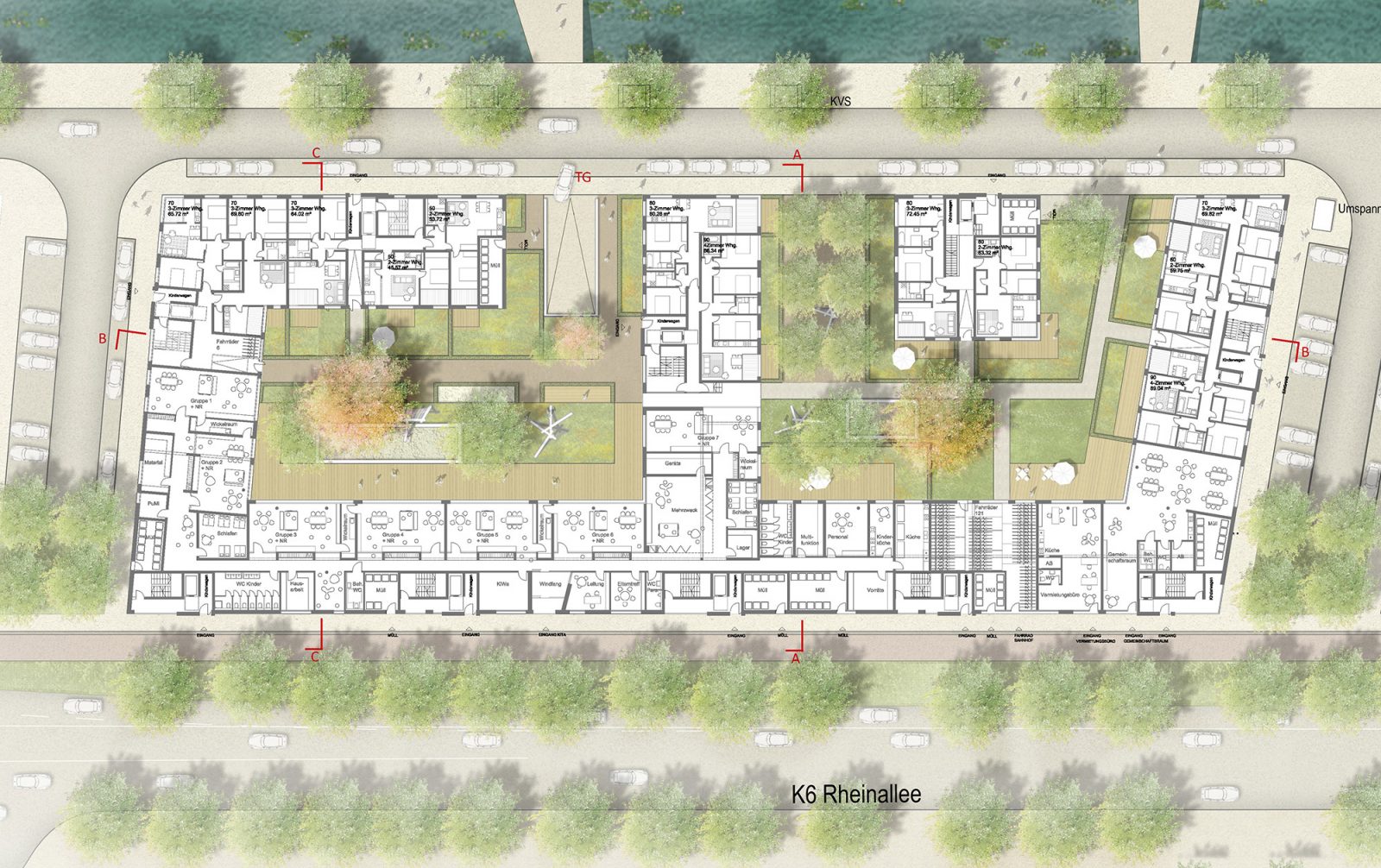 An der Rheinallee und in Teilen der seitlichen ‘Stichstrassen’ entsteht ein ‘gewerblicher’ Sockel: KITA, Gewerbeeinheiten und Gemeinschaftsraum ermöglichen hier eine lebendige Strassenfassade. Die intensiv genutzen Aussenflächen der KITA liegen ausschliesslich im westlichen Innenhof. In den restlichen EG-Flächen werden, dank der Erhöhung des EG-Niveaus, nicht einsehbare Wohnungen vorgesehen.