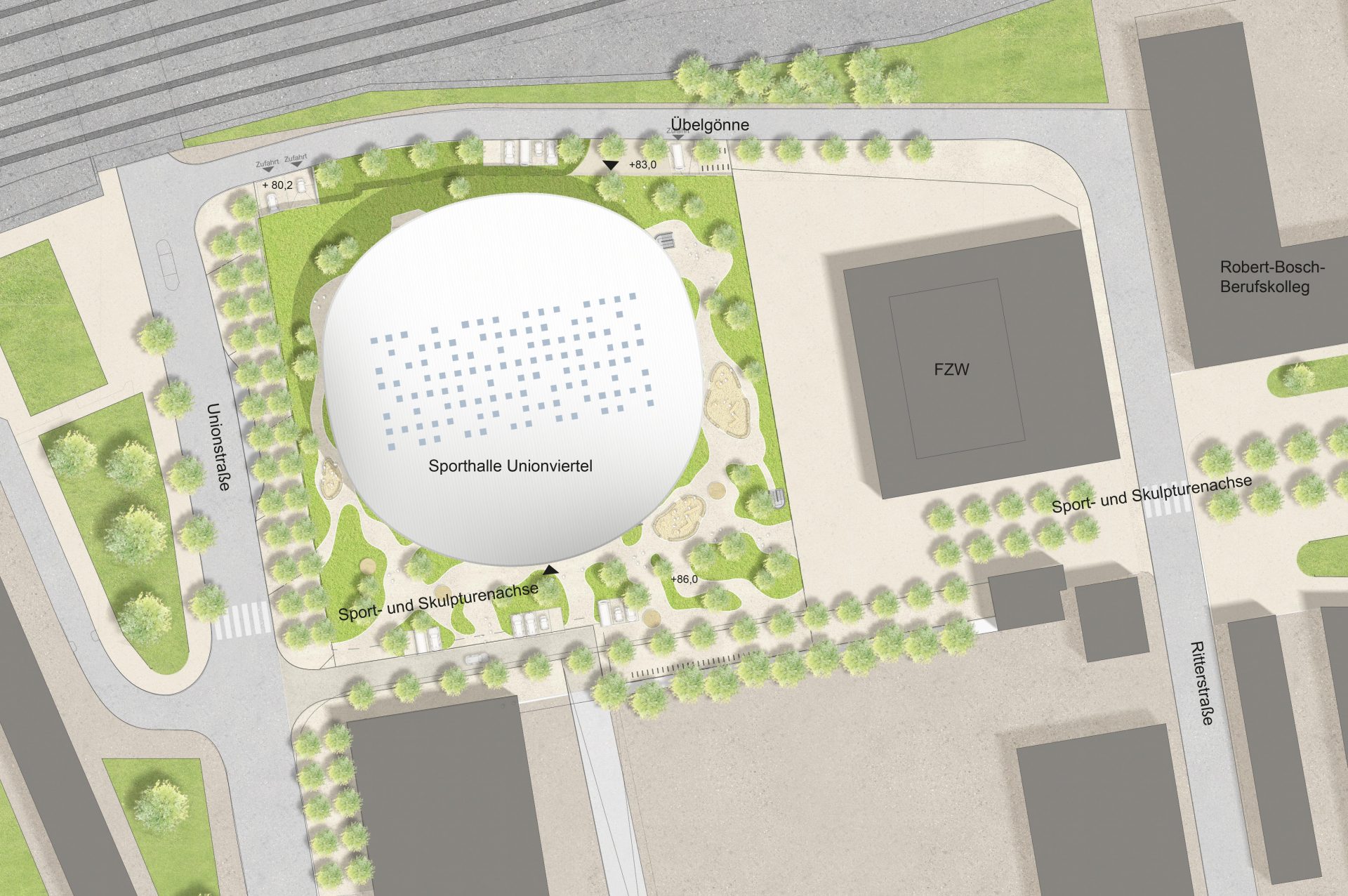 Die angrenzenden Belags- und Straßenflächen werden mit Baumreihen erweitert und durch möglichst viele Grünflächen abgetrennt. Rund um die Sporthalle werden ausreichend Fahrradstellplätze zur Verfügung gestellt.