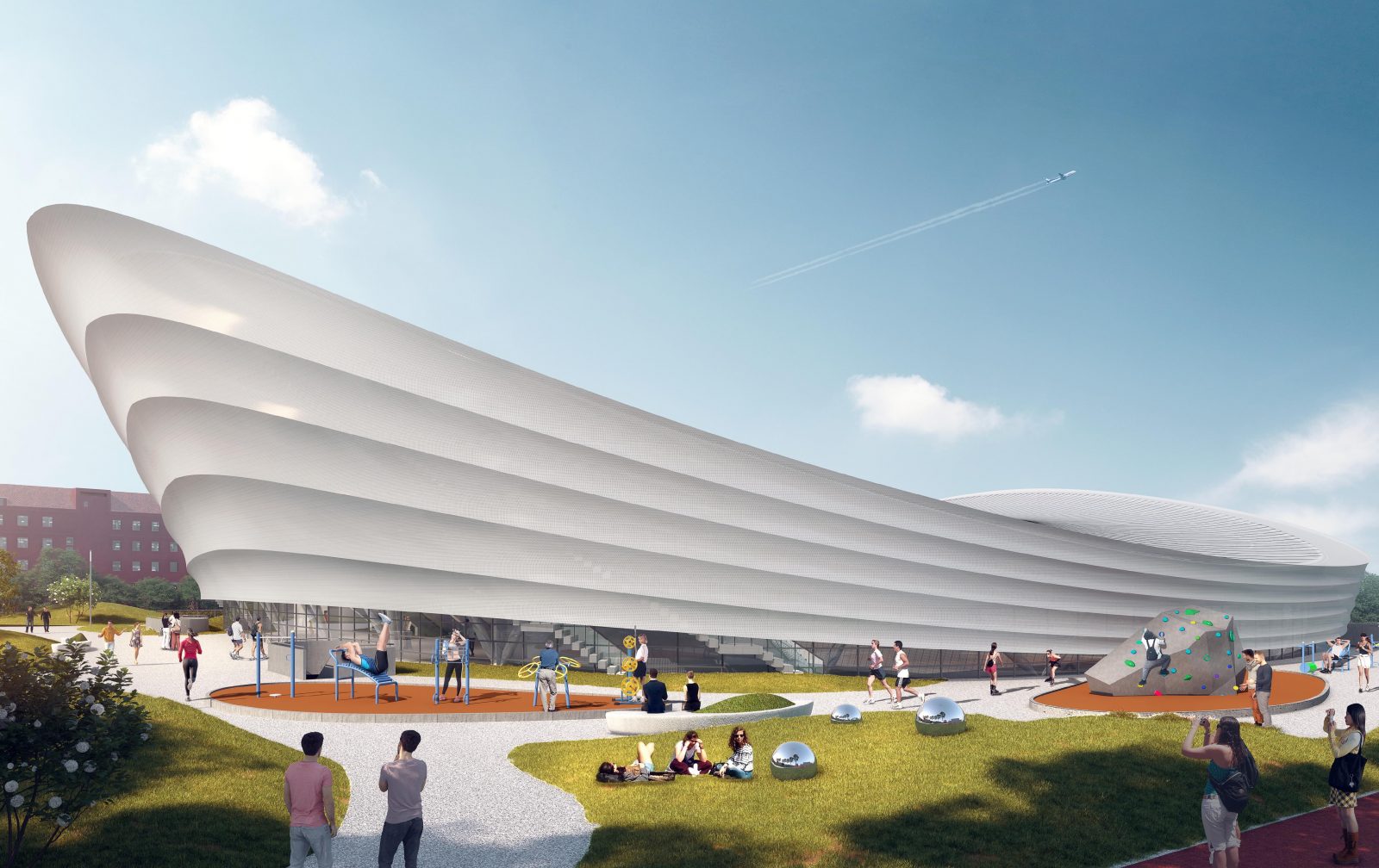 Die Außenraumgestaltung gibt der Sporthalle ein attraktives Umfeld. Die Freiflächen erstrecken sich über die Höhenunterschiede über verschiedene Niveaus. Die oberste Ebene dient als Außenbereich der Sporthalle, mit unterschiedlichen Nutzungsangeboten. Das Thema Sport wird in den Flächen weiter fortgeführt. Die Belagsflächen werden mit einem Possehlbelag durch den geringen Aufbau um die Sporthalle in organischen Formen gelegt. Für eine Durchgrünung der Bereiche sorgen wechselnd hohe bepflanzte Hügel, mit Blumenwiesen und Gehölzen. Zudem kommen zur Formensprache der Rasenfläche Spiel- und Sportflächen, aus Tartanbelag oder Sand. Es entsteht ein aktives Umfeld mit schönen Plätzen zum Verweilen in der Sonne oder im Schatten der Bäume.