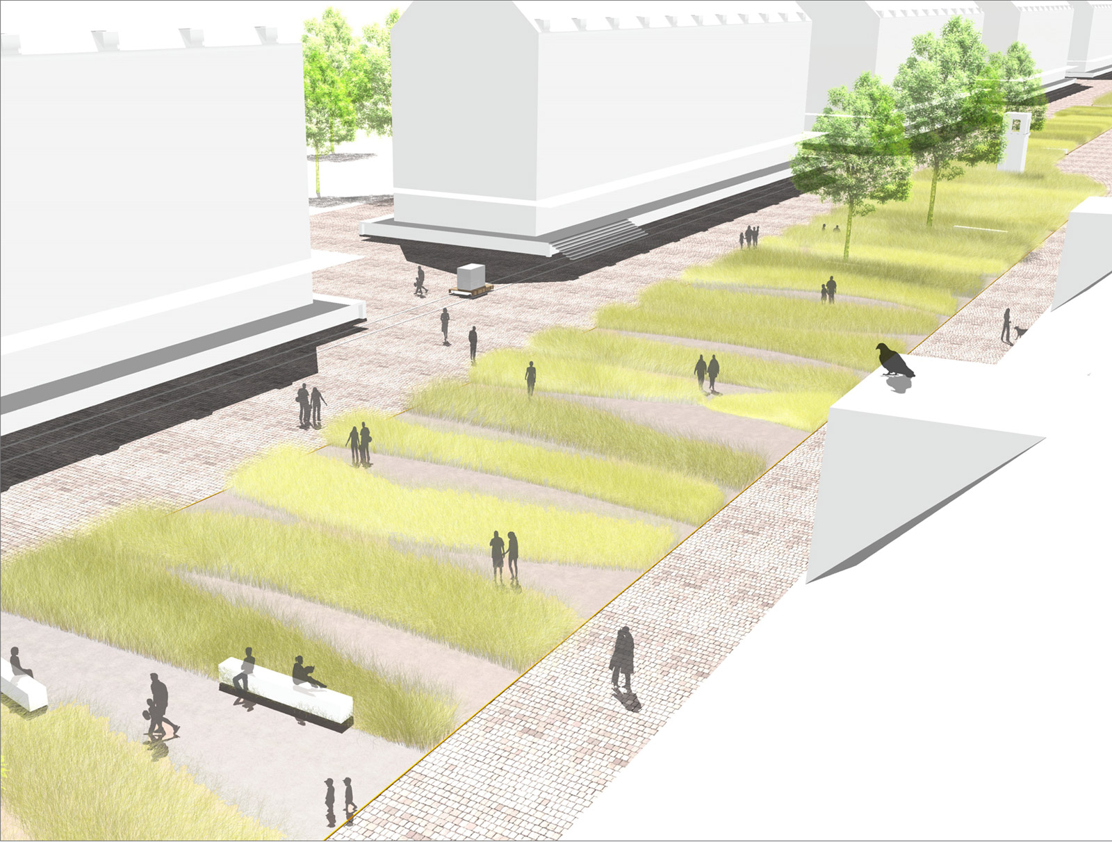Durch einen behutsamen Umgang mit dem historischen Kontext und der Wahrung der unter Denkmalschutz stehenden Substanz entsteht ein neuer, besonderer Ort. Zentrales Element ist das grüne Band welches sich zwischen den Speichergebäuden erstreckt. Hier entsteht in den Grenzen der historischen Form ein durchlässiges Membran einer Gräserlandschaft.