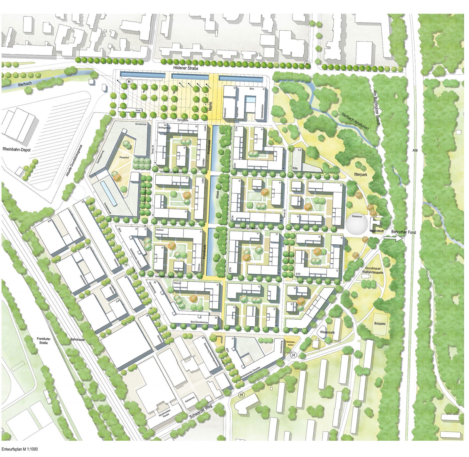 Der Itterbach wird renaturiert und trägt zur Identifikation des Quartiers wesentlich bei. Relikte der ehemals industriellen Vornutzung, z.B. Schlingenturm, Klärwerk mit Klärbecken, Werksgasse, etc., werden aufgenommen, sinnvoll interpretiert und in das Quartier integriert. Zusammen mit der neuen Mitte erzählen Sie als „Identifikationsorte“ authentische Geschichten zum Ort und seiner Vergangenheit.