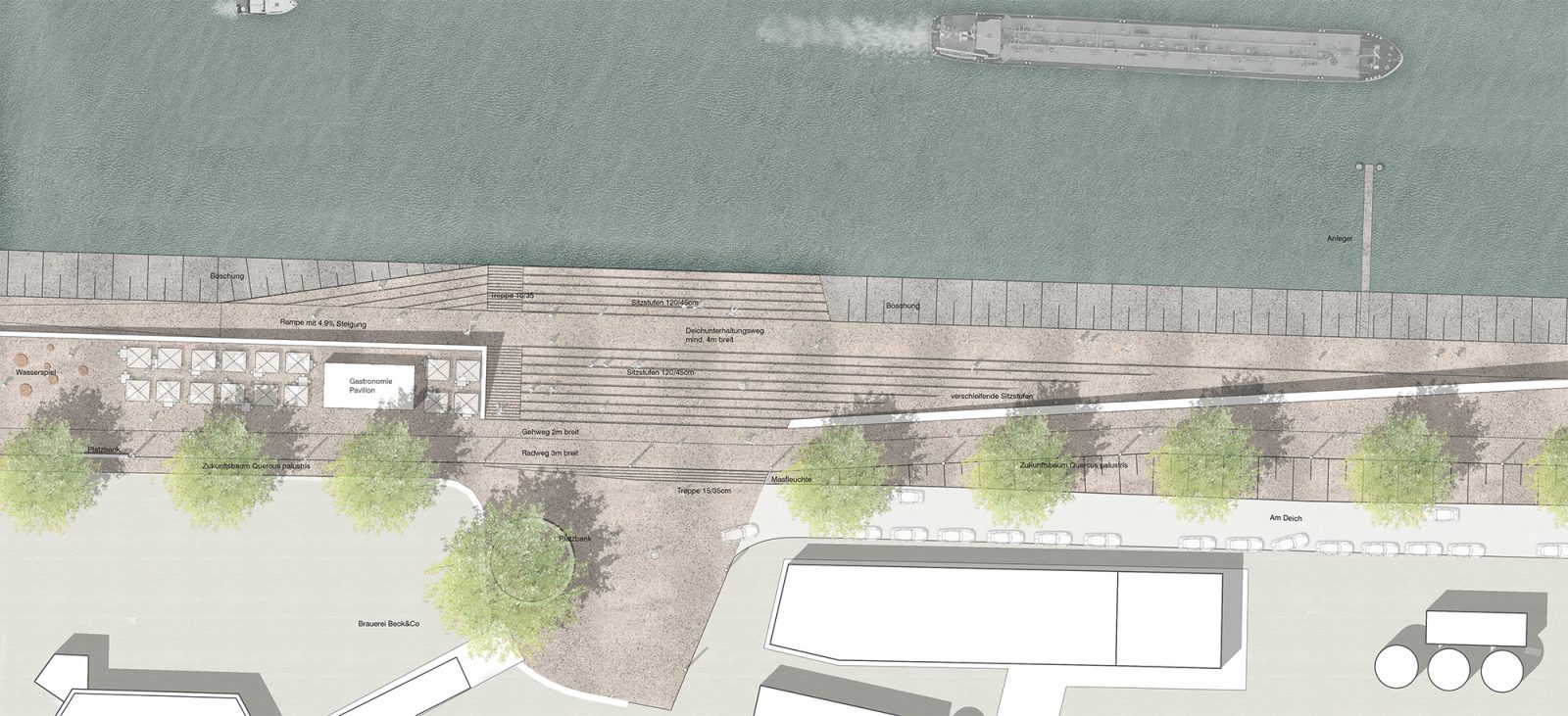 Mit der Neugestaltung des Uferbereiches wird sich nach Jahrzehnten der Raum entlang der Weser wesentlich verändern. Durch die Erneuerung und die Notwendigkeit der Verbesserung des Hochwasserschutzes entsteht ein neues, anderes Ufer, dessen skulpturales Erscheinungsbild diesen Ort nachhaltig prägen wird.