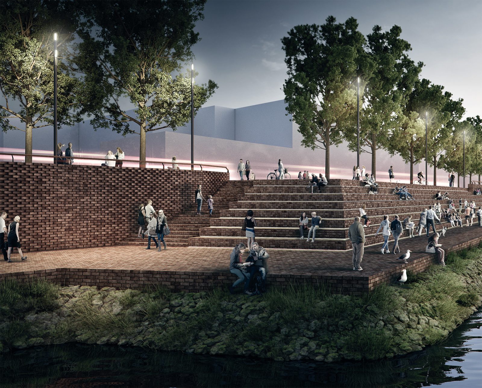Die Hochwasserschutzwände werden mit Klinker verkleidet. Auf der Wasserseite interpretiert der Klinker die Wellenbewegungen der Weser neu. Dadurch ergibt sich ein abwechslungsreiches, dynamisches Relief über die gesamte Länge der Stadtstrecke.