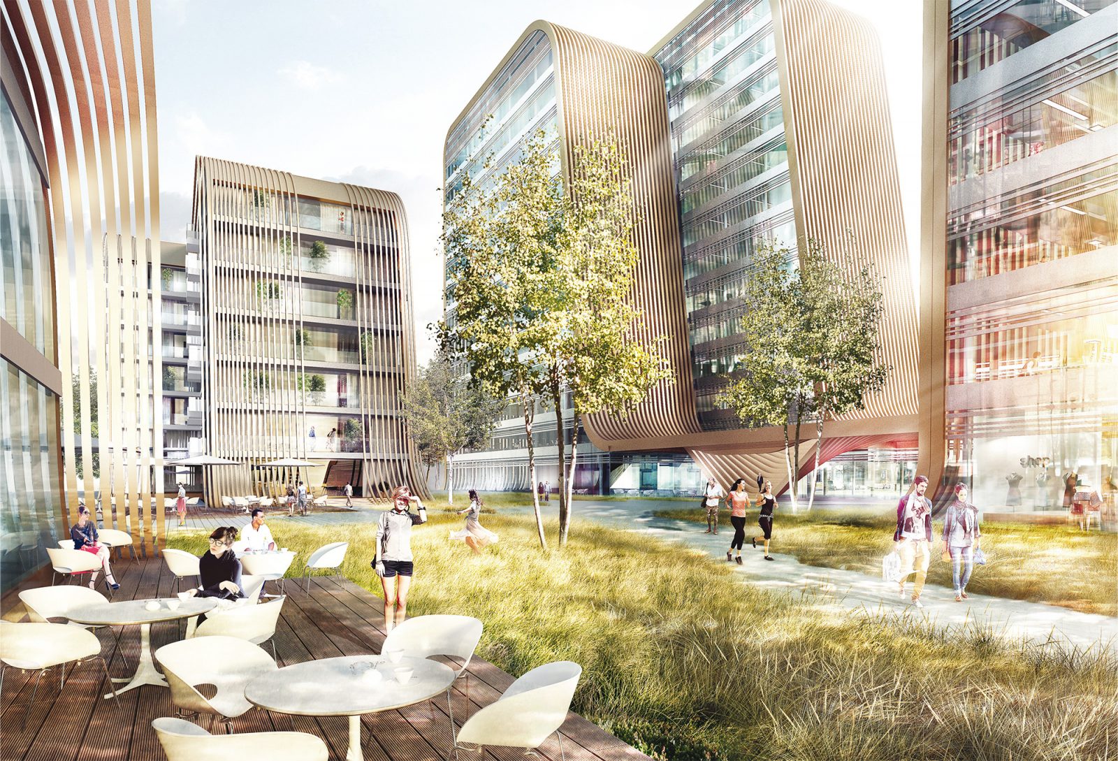 Das bestehende System der angehobenen Fußgängerbereiche wird in den Entwurf integriert und im Bereich der Bürohäuser von einem angehobenen Deck in einen fließenden grünen Platzraum überführt. Der Freiraum wird als prägnanter Park wie eine Dünenlandschaft ausgebildet. Dabei werden Cafés und Gastronomie als belebende Elemente mit großzügigen Freibereichen integriert. Der Außenraum soll als wertvoller Erlebnisraum für alle erlebbar werden.