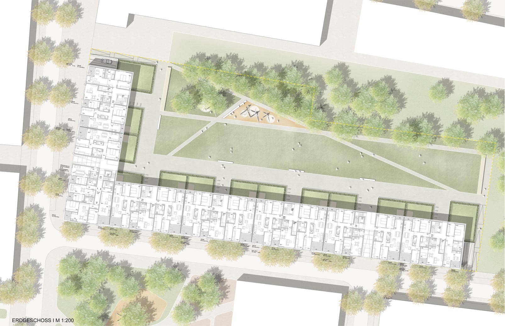 Intention der Entwurfsverfasser ist es, einen qualitätvollen „Zwischenraum“ zu gestalten, in dem sich die Grenzen von privat und öffentlich als fließende Übergänge ergeben.