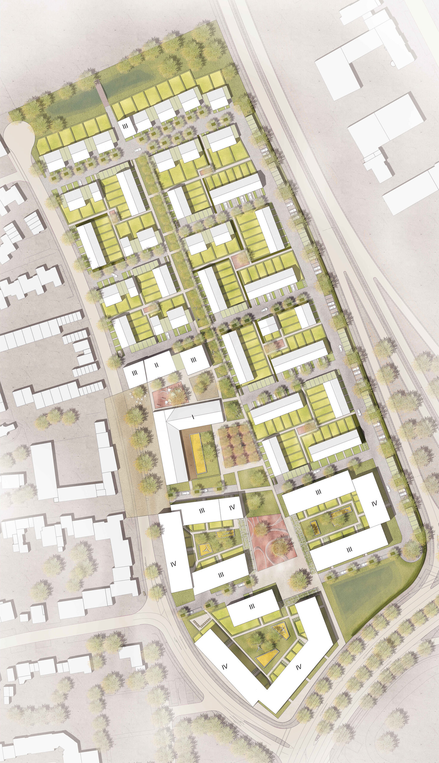 Zentrales Element ist dabei die Freiraumachse in Nord-Süd Richtung. Diese verbindet und erschließt fußläufig nicht nur das neue Wohngebiet, vielmehr schafft es eine abwechslungsreiche Spiel- und Freizeitlandschaft.