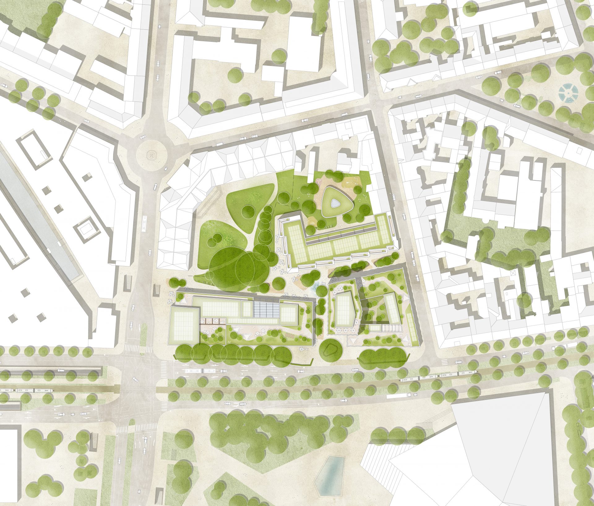 Das Freiraumkonzept basiert auf dem Prinzip der „grünen Inseln“. Diese bilden ein Netzwerk aus unterschiedlich zusammengesetzten Pflanzflächen, die vielfältige Möglichkeiten zum Verweilen bieten. Dabei fungieren die Grünflächen als Trittsteine zwischen den unterschiedlichen Funktionen der Architektur und fördern zugleich die soziale Interaktion. Lange, sich kreuzende Achsen laufen als Korridore entlang der Gebäudekanten und gewähren einen direkten Zugang zu den Einrichtungen. Im Zentrum der kreuzenden Achsen entsteht ein lebendiger Aufenthaltsbereich als Begegnungsort mit Gastronomie, Kultur und Spielangeboten. Ein Wasserspiel wirkt nicht nur dem städtischen Wärmeinseleffekt entgegen, sondern greift als Bühne die musikalische Präsenz der umliegenden Gebäude auf.