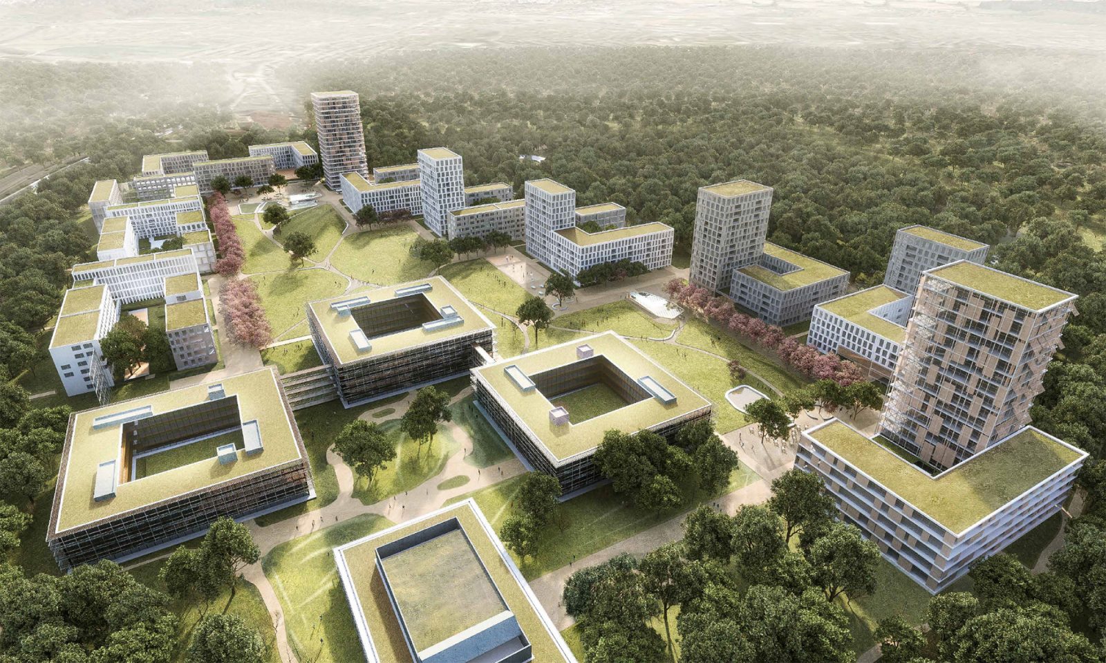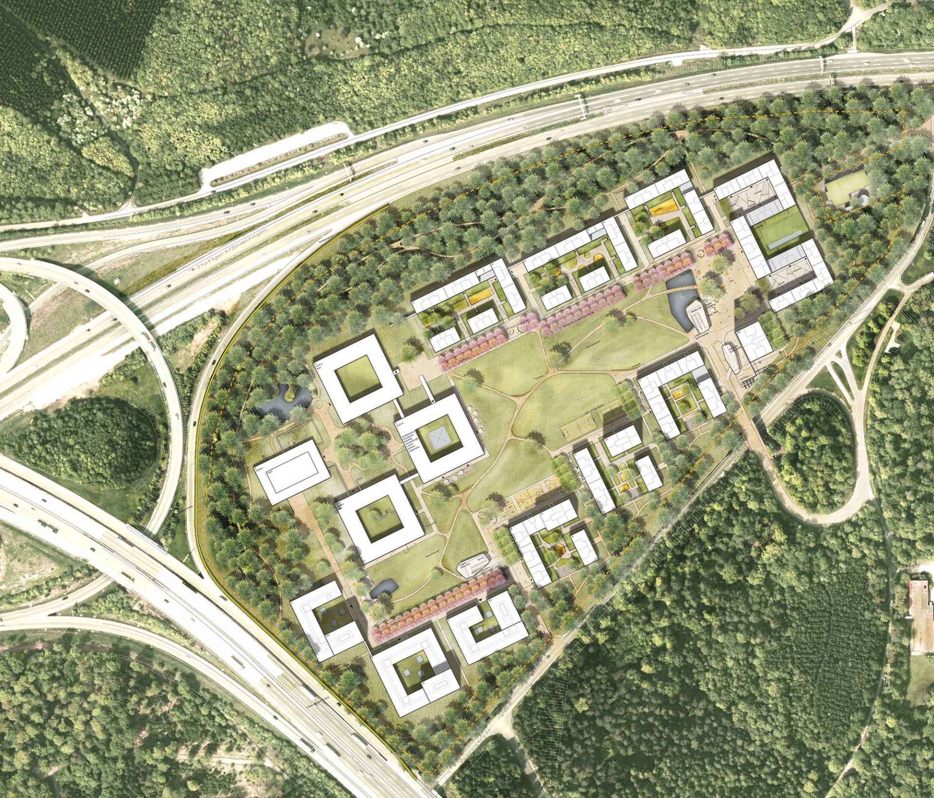 Eingebettet in die umgebende Waldlandschaft öffnet sich im Inneren ein ganz andersartiger Freiraum….die Lichtung. Diese großzügige Rasenlandschaft ist locker mit Bäumen überstellt und wird zu den Randbereichen durch notwendige Erschließung- und Aufenthaltsflächen räumlich gefasst. Baumkarrees aus japanischen Kirschen definieren dabei die Spiel- und Kommunikationsbereiche. Ein landschaftliches Wegenetz durchzieht den Raum. Die Sportflächen liegen wie selbstverständlich eingebettet in diesem Freiraum. Der Stadtplatz im Osten wird ebenso wie der Raum im Businessbereich mit einer großzügigen Wasserfläche zusätzlich akzentuiert.