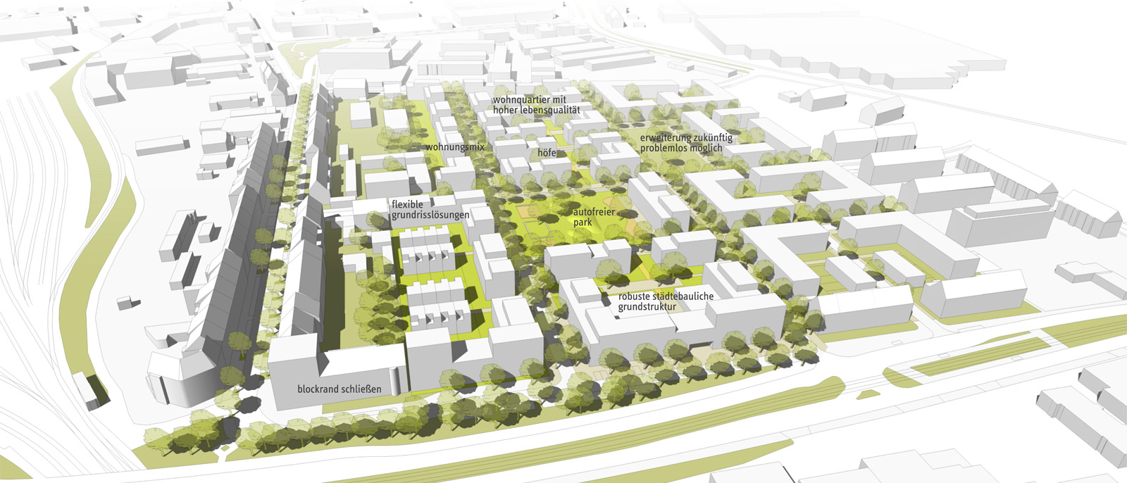 Ausgangspunkt der Entwicklung ist ein neuer Quartierspark, das grüne Herz des neuen Quartiers.