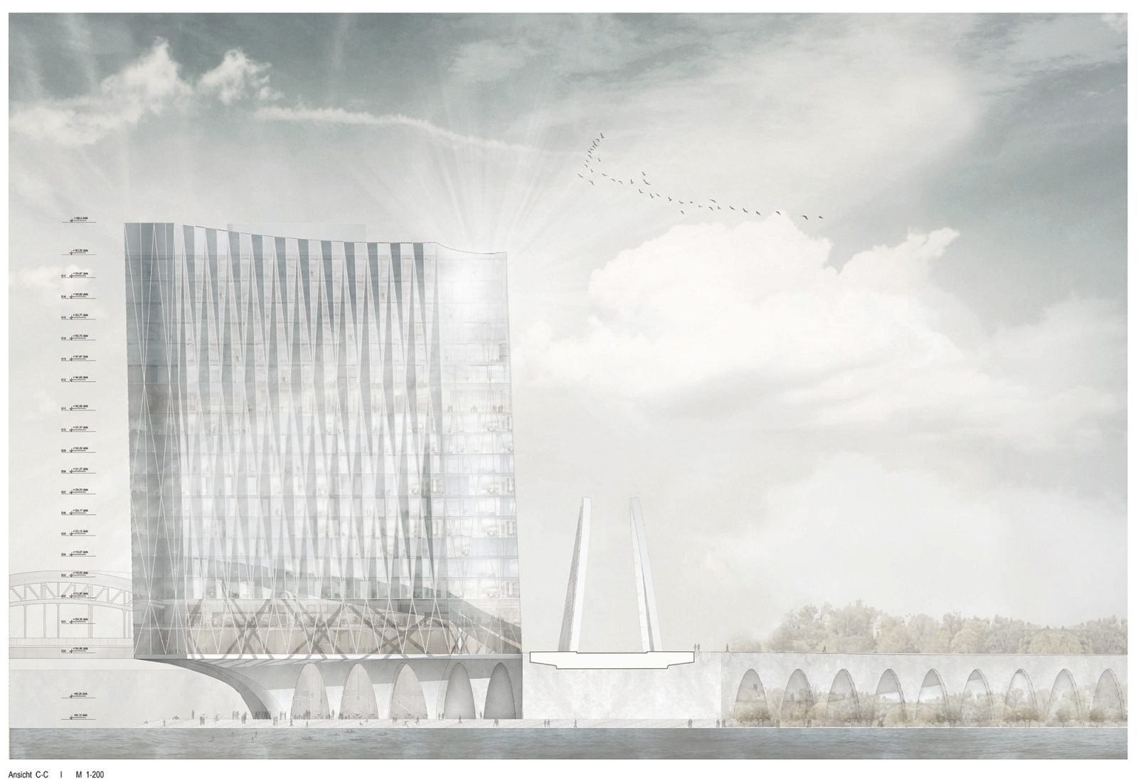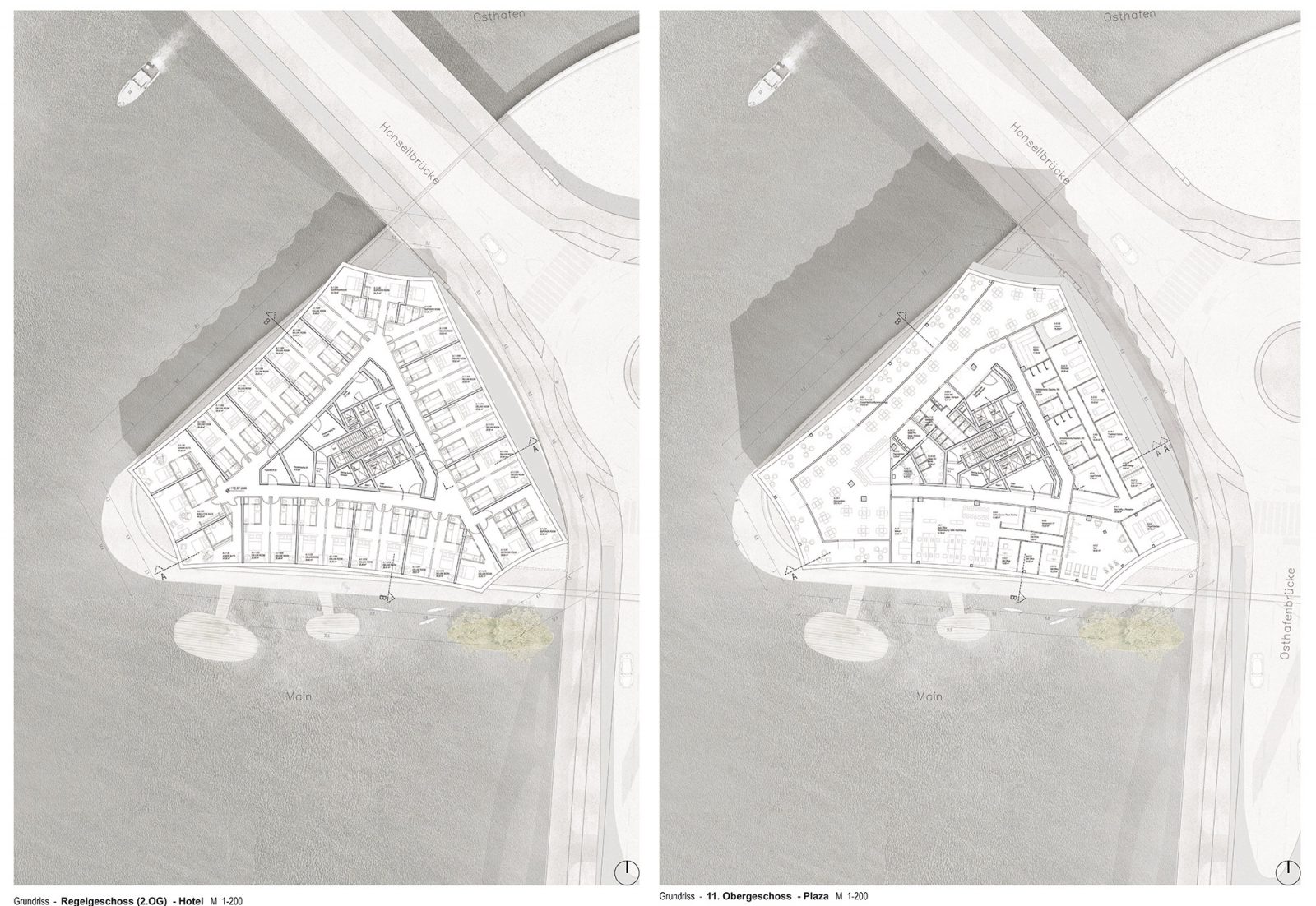 Der Entwurf sieht einen – eigenständigen Turm vor, der sich gestalterisch von dem verdrehten, fraktalen Doppelturm der ECB aber auch den ausgerundeten Dreiecksfiguren der beiden, kleinen Wohntürme des hafenpark-quartiers absetzt. Durch die individuelle Gestalt des neuen Turms entsteht so mit den Hochpunkten in der Umgebung ein Dreiklang in welchem der neue ‚Leucht-Turm‘ durch seine autonome Gestalt und Architektur eine besondere landmarkdarstellt. Point de vue am Molenkopf – eine breite sitzstufe lädt zum Verweilen und Genießen der Aussicht ein. Treppenstufen an den Seiten verbinden zum unteren Gehweg und suchen den Kontakt zum Wasser. Entlang der Mainseite wird die bestehende biotopartige Landschaft aus kleinen Inseln und Gehölzen östlich der Brücke konsequent zum Molenkopf fortgeführt. Aus dieser inselartigen Struktur entwickeln sich zwei schwimmende Pontons die den Beachclub Bereichern, und auch als Anlegestelle, dienen können.