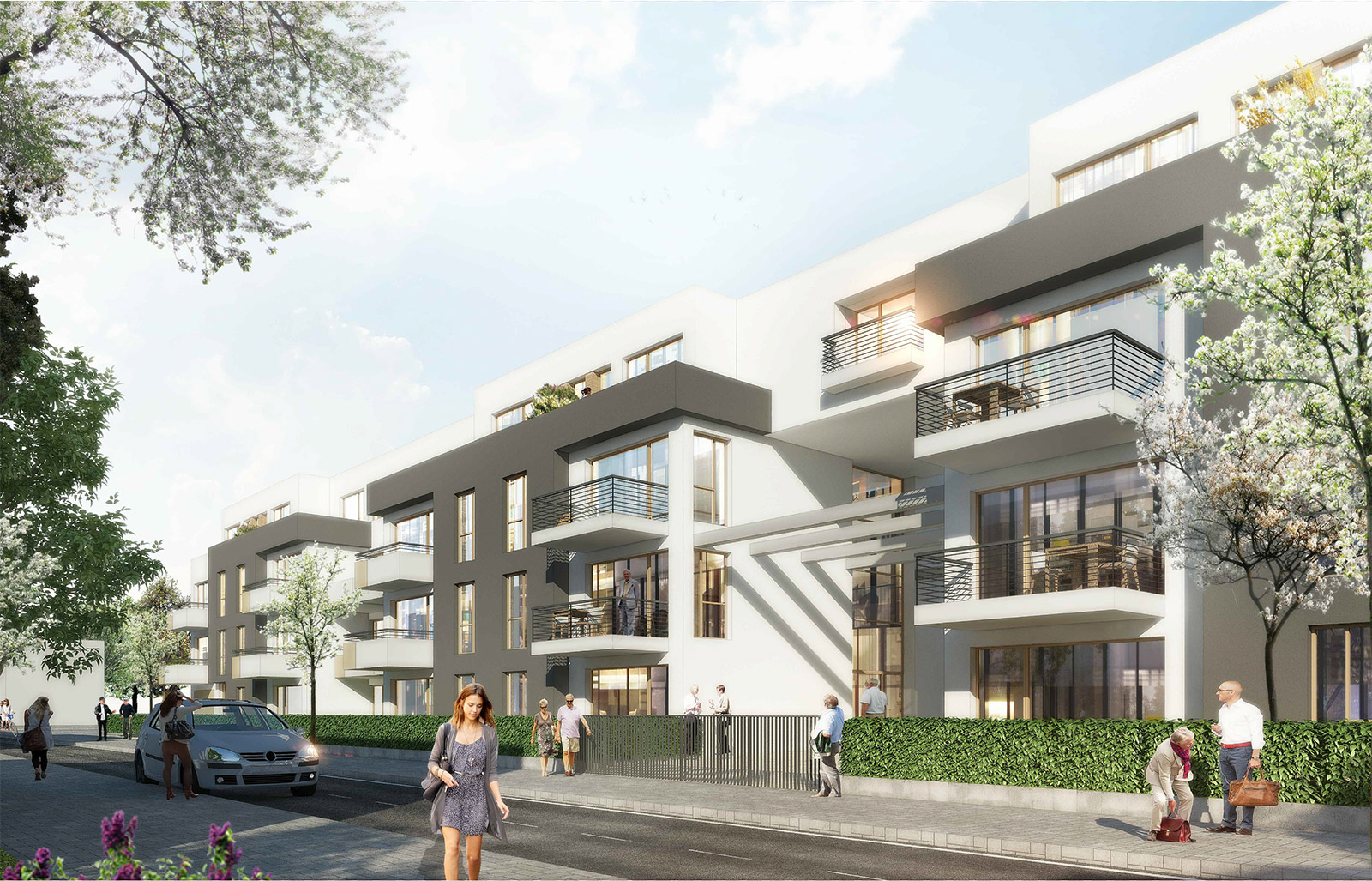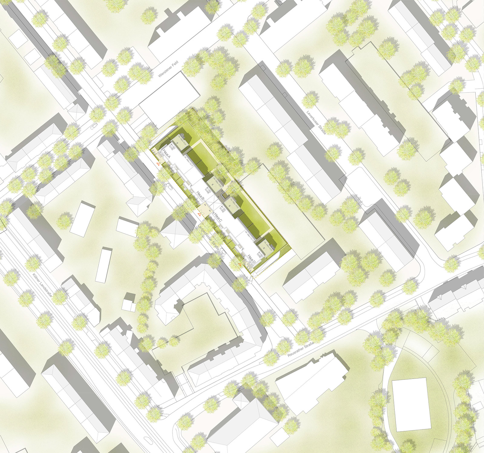 Abgeschirmt und eingefasst durch Hecken und Toranlagen entstehen sowohl proportionierte Grünanlagen mit Gemeinschafts- und Spielflächen sowie erdgeschossbezogene Mietergärten. Im zentralen Hofbereich liegt für das Kleinkinderspiel ein Sandkasten mit Spielgeräten und Sitzeinfassung. Die Gärten sind mit Hecken abgegrenzt und offen zu den gemeinschaftlichen Flächen. Pflanzflächen mit Gräsern und Stauden liegen dazwischen. Sitzkuben, frei verstreut, laden zum Verweilen ein. Notwendiger Baumersatz wird mit planungsbezogenen Neupflanzungen im Straßenbereich und durch locker gestellte Solitärbäume im Innenbereich erreicht.