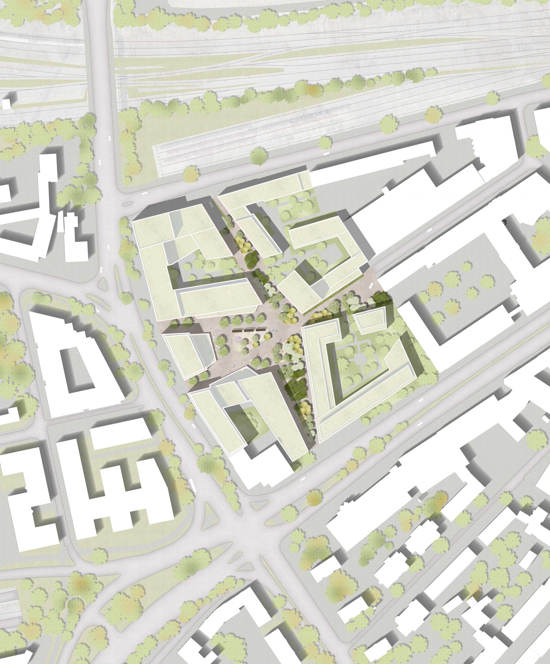 Um den Aspekten des Klimawandels und den damit verbundenen Starkregenereignissen gerecht zu werden, ist der Freiraum stark begrünt und für seine zentrale, urbane Lage möglichst „gering“ versiegelt. Die Fahrradständer sind dezentral an allen Eingängen sowie im Platzbereich angeordnet.