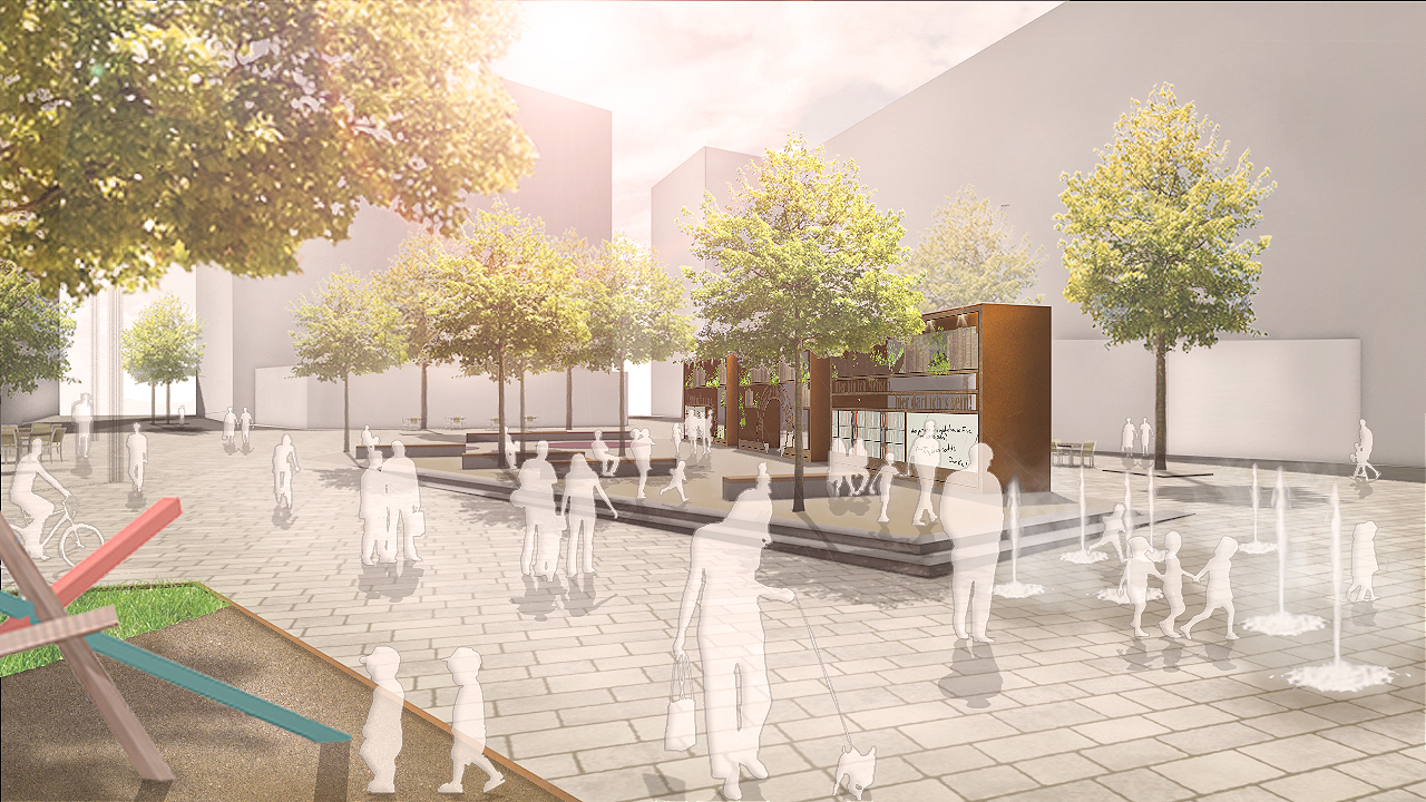 Zentrum des Quartiers ist der neue „Platz der Literatur“ mit einem großen Buchregal mitten auf dem Platz. Hier wird gelesen, gespielt, kommuniziert, nachgedacht und sich erholt. Das Buchregal aus Corten-Stahl – eine Reminiszenz an die Tradition der Stahlherstellung im Ruhrgebiet – gibt diesem Ort eine Identität. In dem Regal können Bücher platziert, ausgeliehen und verschenkt werden und es bietet verschiedene Spielmöglichkeiten rund um die Papierherstellung an. Verschiedene Wasserfontänen und Nebeldüsen geben dem Platz einen zusätzlichen spielerischen Akzent und verbessern zudem merklich das Kleinklima.