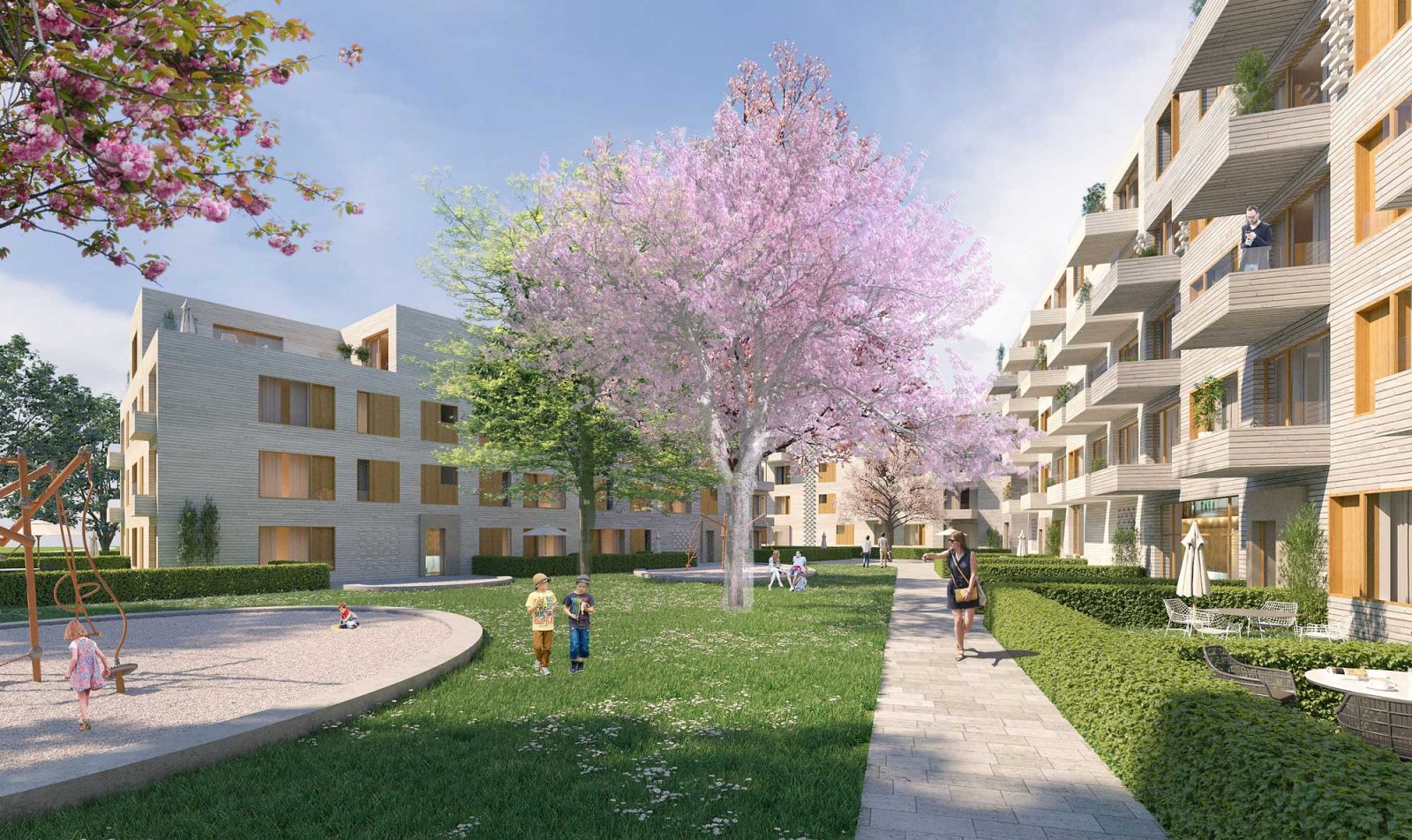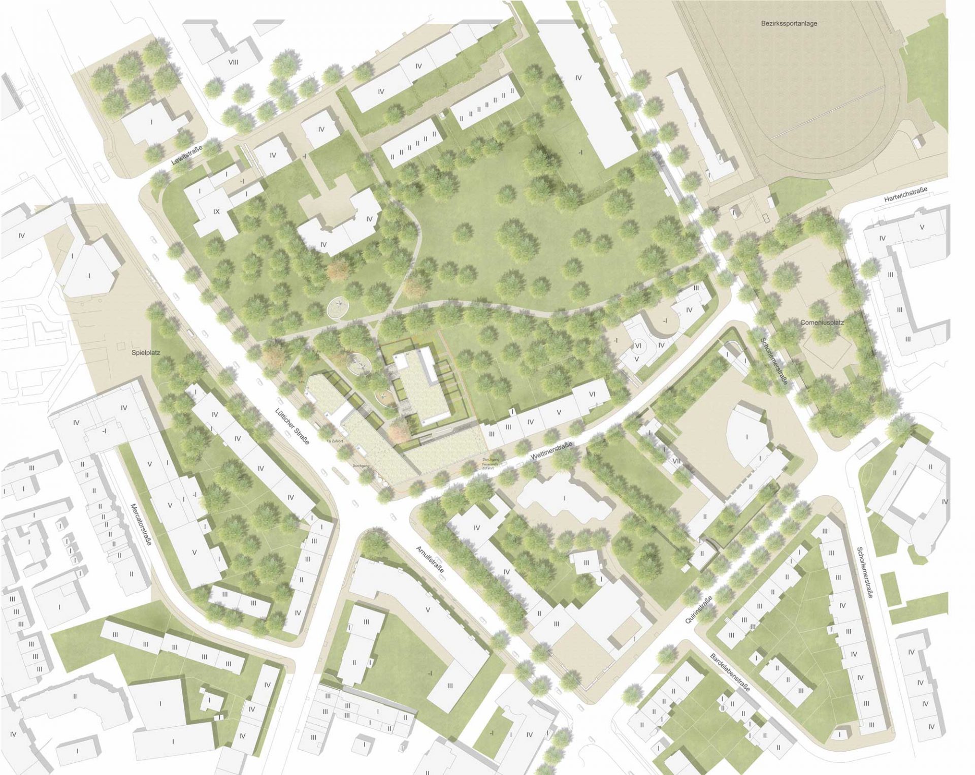 Die erdgeschossigen Garten- bzw. Terrassenflächen im Innenhof werden intensiv begrünt mit Hecken gegenüber den sich anschließenden öffentlichen Räumen abgegrenzt. Die Hauseingänge erhalten größere befestigte Freibereiche mit Abstellmöglichkeiten für die Fahrräder.