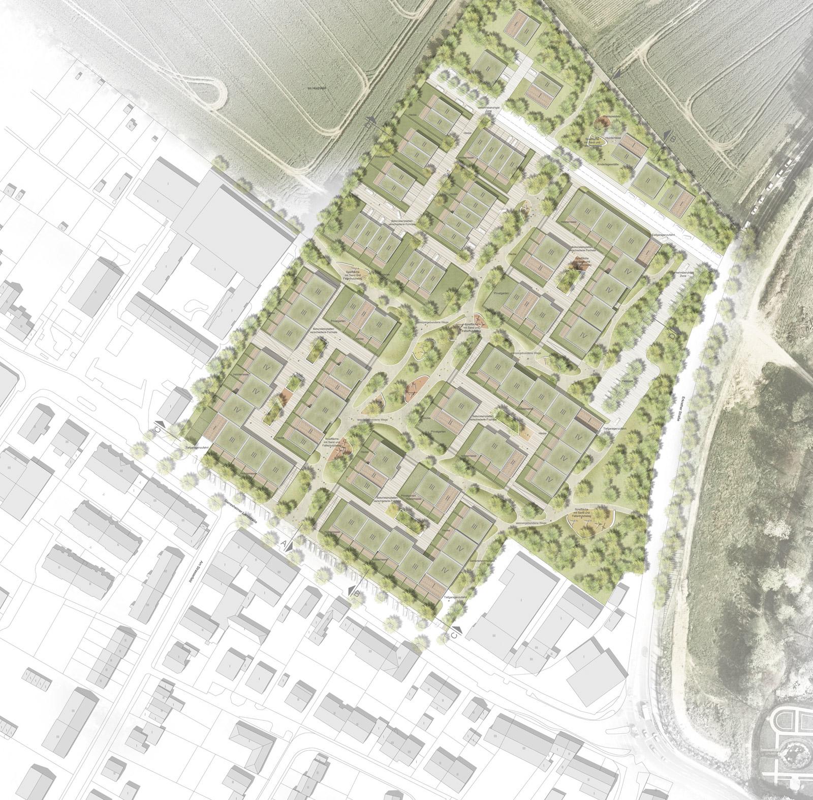 Die „Grüne Mitte“ ist nicht als Landschaftspark gedacht, sondern vielmehr als stark durchgrünte dörfliche Angeranlage. Sie ist Mittel- und Treffpunkt der verschiedenen Klein-Nachbarschaften (Vierseithöfe) und der Alt-Unterbacher.