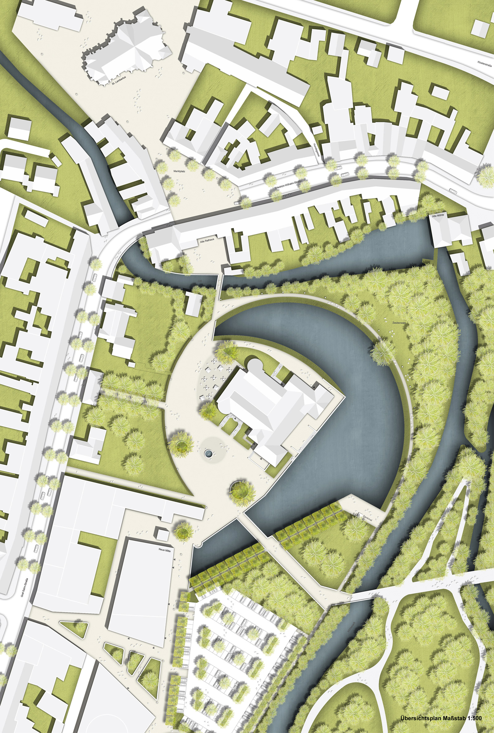 Um das Schloss entsteht ein großerzügiger Platz der das prägnante Gebäude in seiner Aussenwirkung stärkt. Die Freiräume um das Schloss werden in verschiedene funktionale Aspekte aufgeteilt, wie z.B. die Aussengastronomie, fußläufige Verbindungen und die Ruhrbereiche im Schlosspark. Diese lassen sich nahtlos in die großzügige Kreisform integrieren. Die historischen Bezüge wie das Torhaus, der Brunnen und der alte Baumbestand werden in das neue Freiraumkonzept integriert.