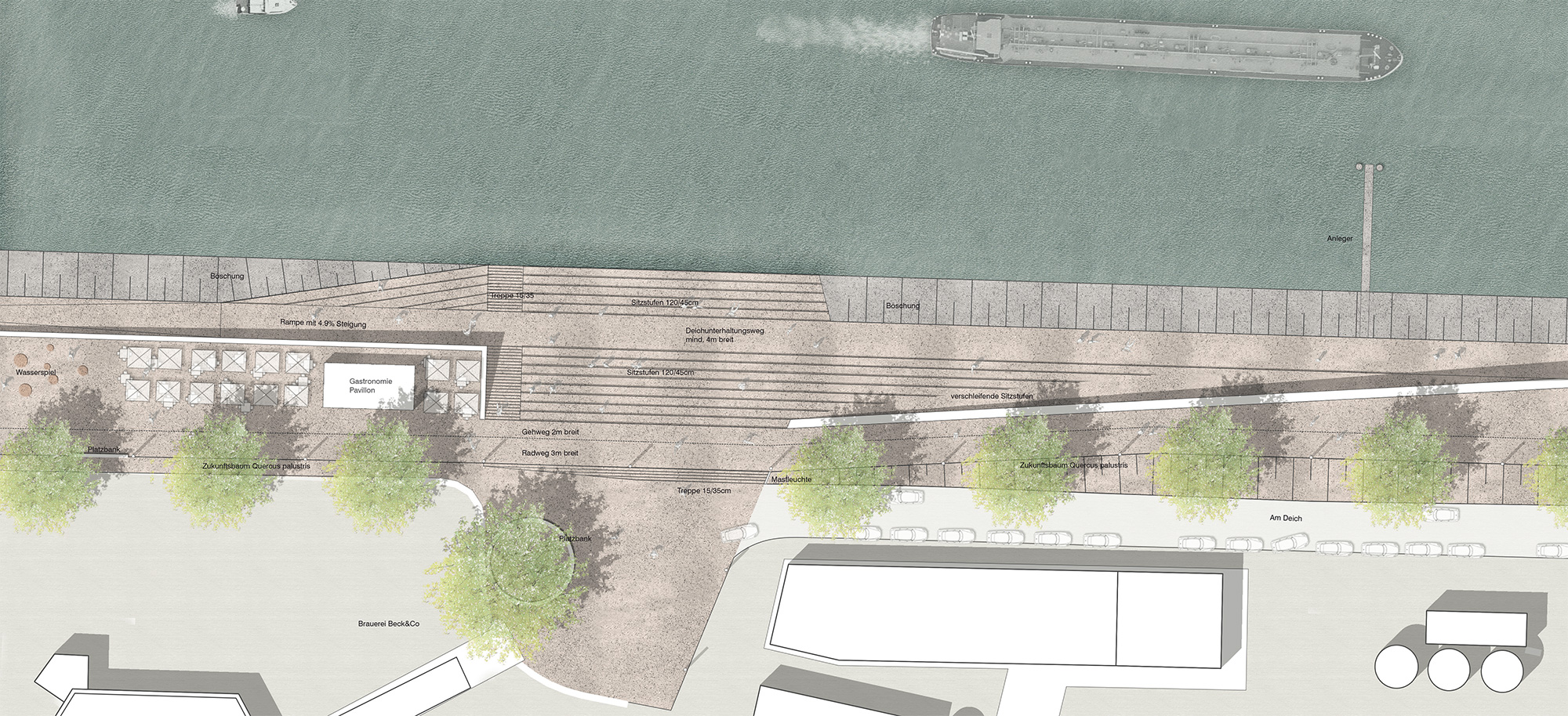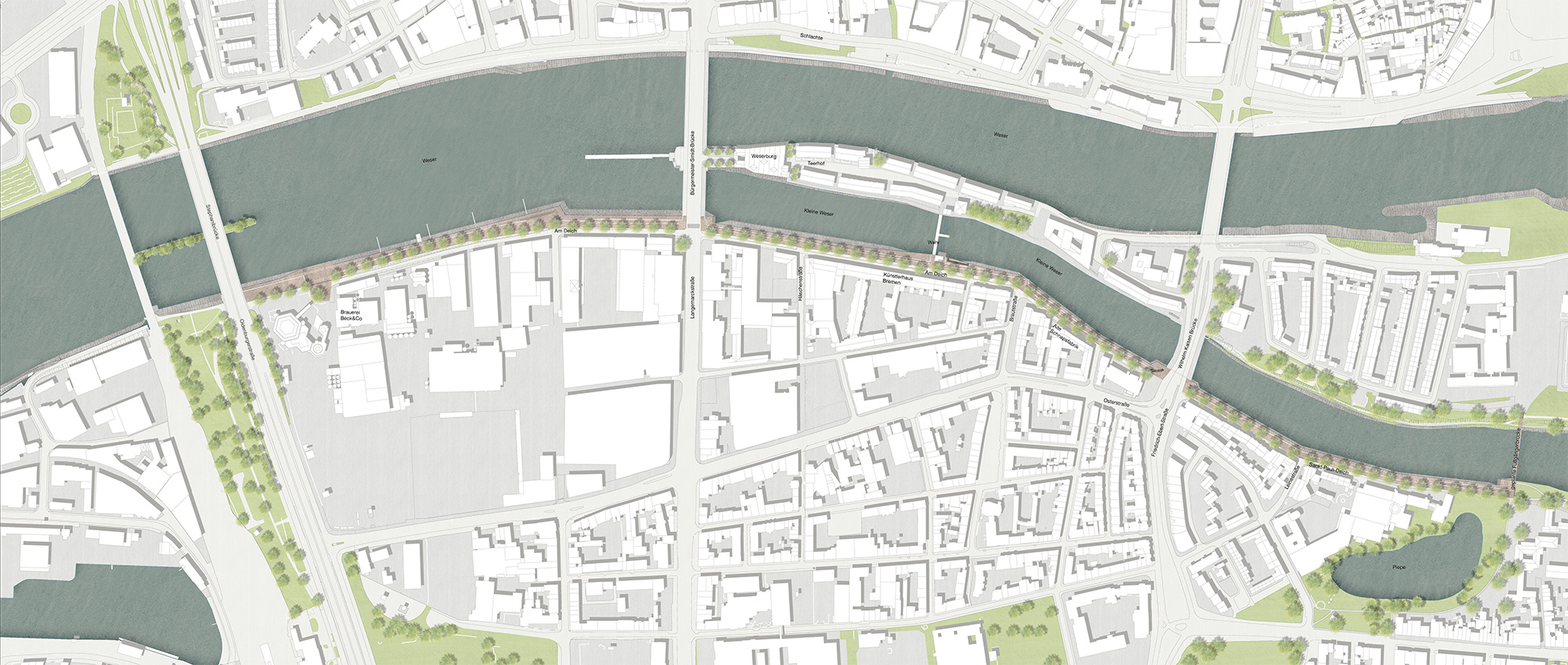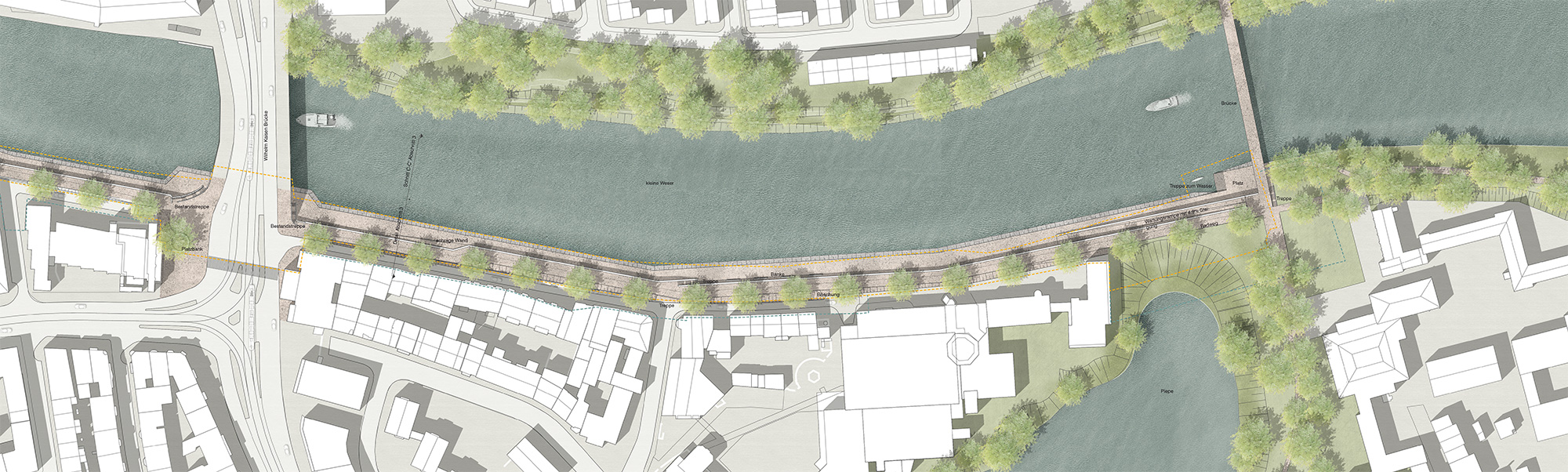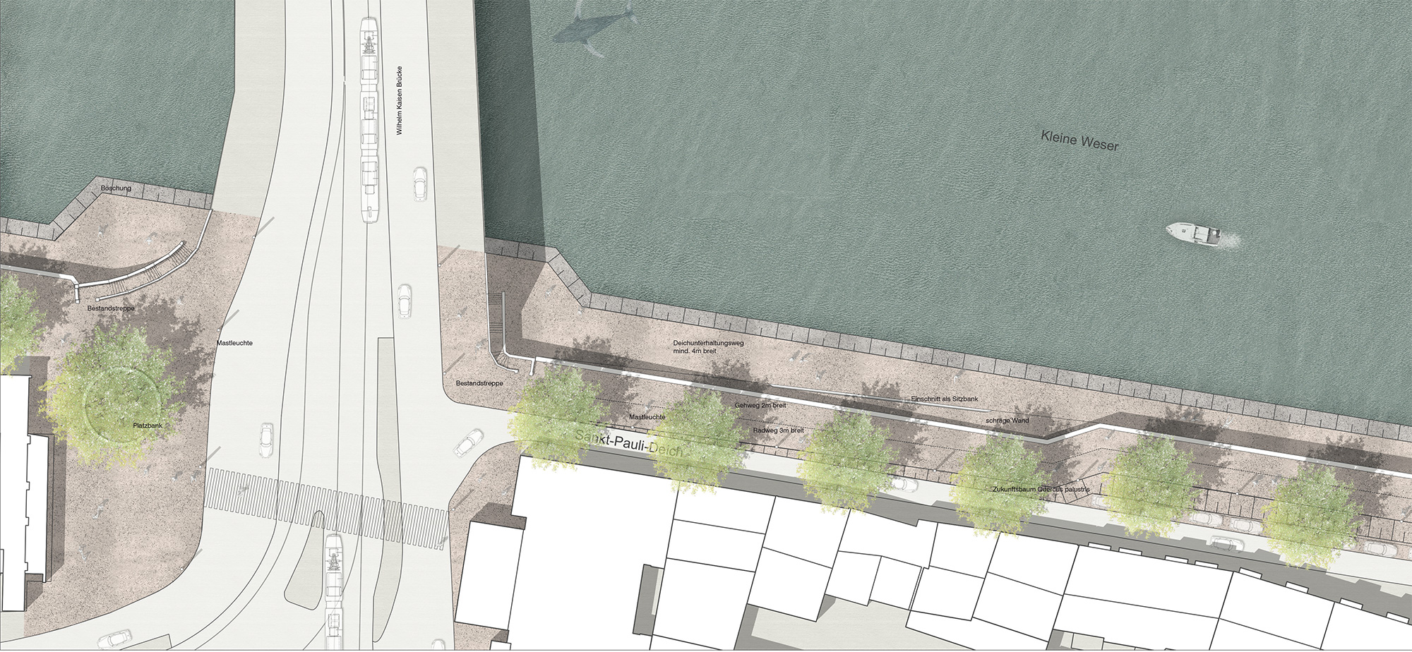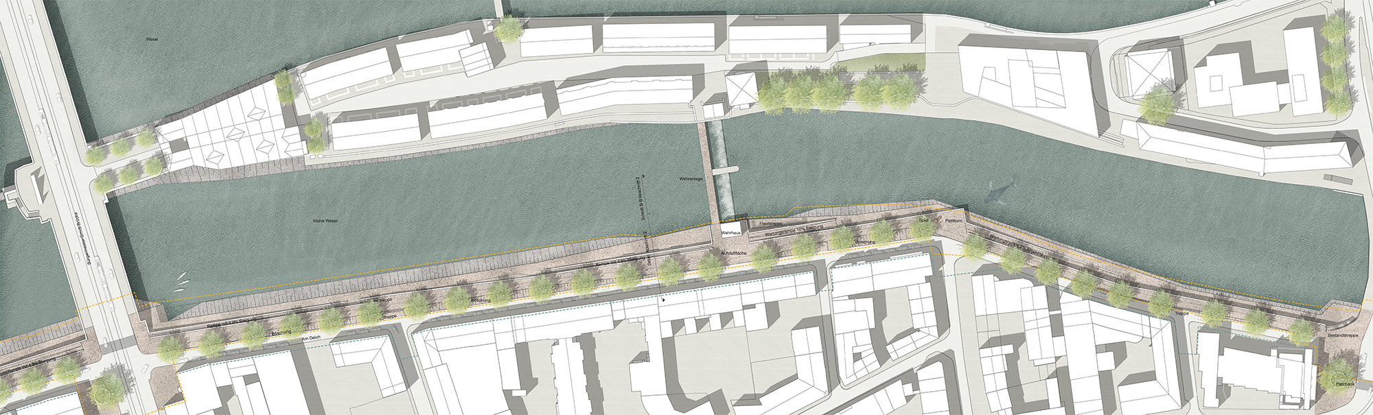 Mit der Neugestaltung des Uferbereiches wird sich nach Jahrzehnten der Raum entlang der Weser wesentlich verändern. Durch die Erneuerung und die Notwendigkeit der Verbesserung des Hochwasserschutzes entsteht ein neues, anderes Ufer, dessen skulpturales Erscheinungsbild diesen Ort nachhaltig prägen wird.