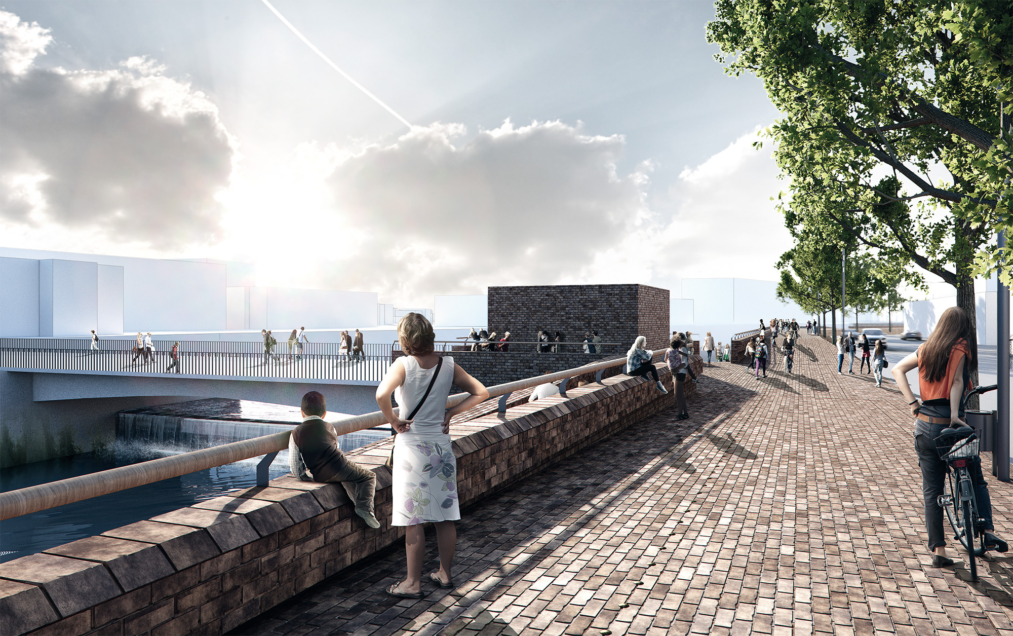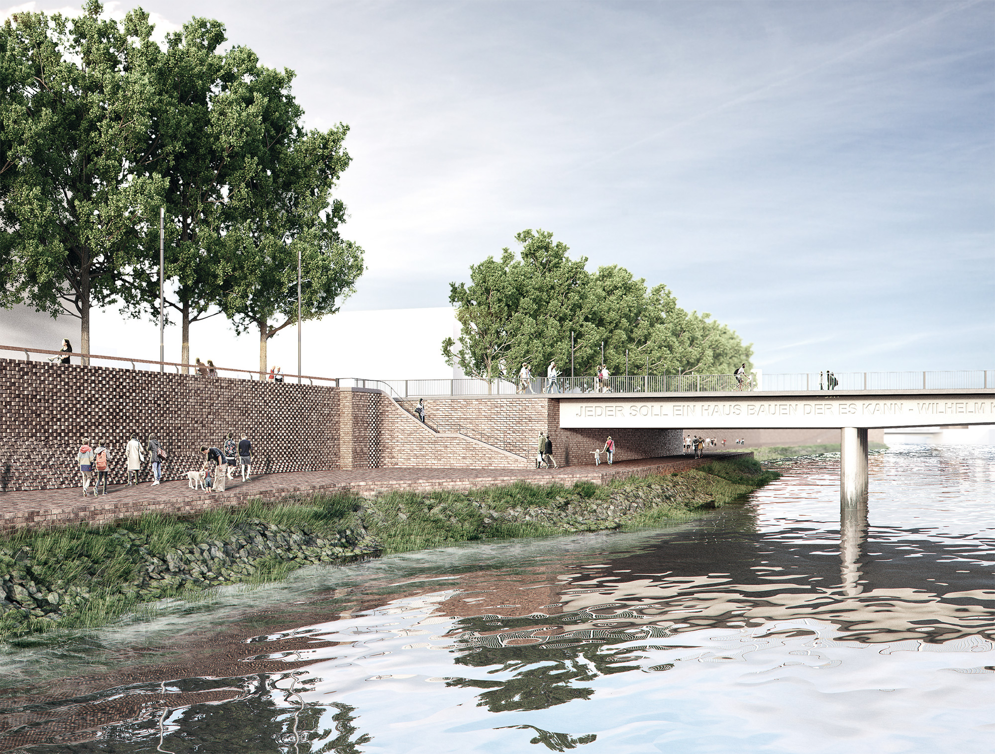 Die Hochwasserschutzwände werden mit Klinker verkleidet. Auf der Wasserseite interpretiert der Klinker die Wellenbewegungen der Weser neu. Dadurch ergibt sich ein abwechslungsreiches, dynamisches Relief über die gesamte Länge der Stadtstrecke.