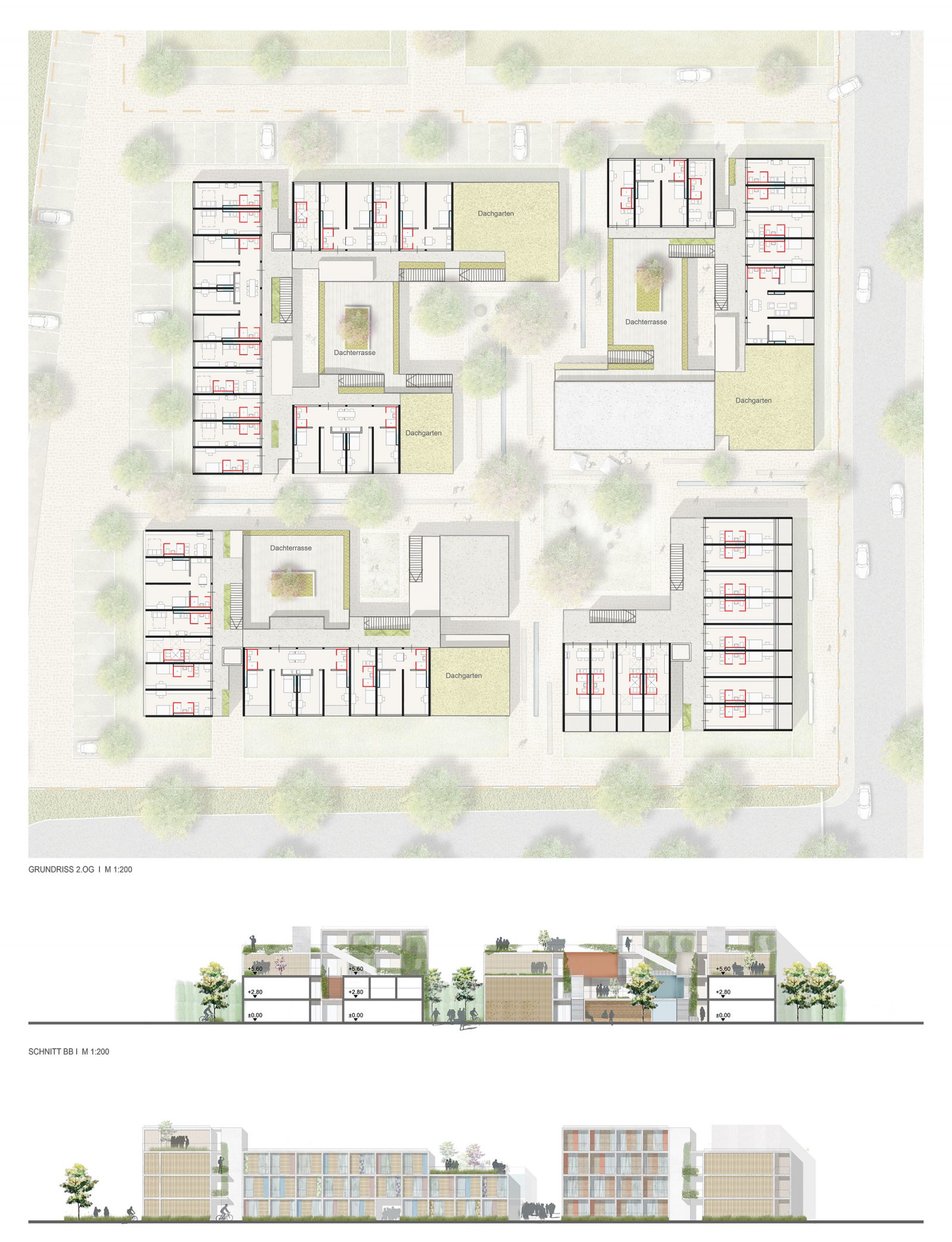 Zwischenräume aus kleineren und größeren Plätzen und Höfen bieten Außenraumqualitäten von fast dörflichem Charakter mit Grün- und Spielflächen, welche für Gruppen genauso wie für Einzelpersonen angenehm sind.