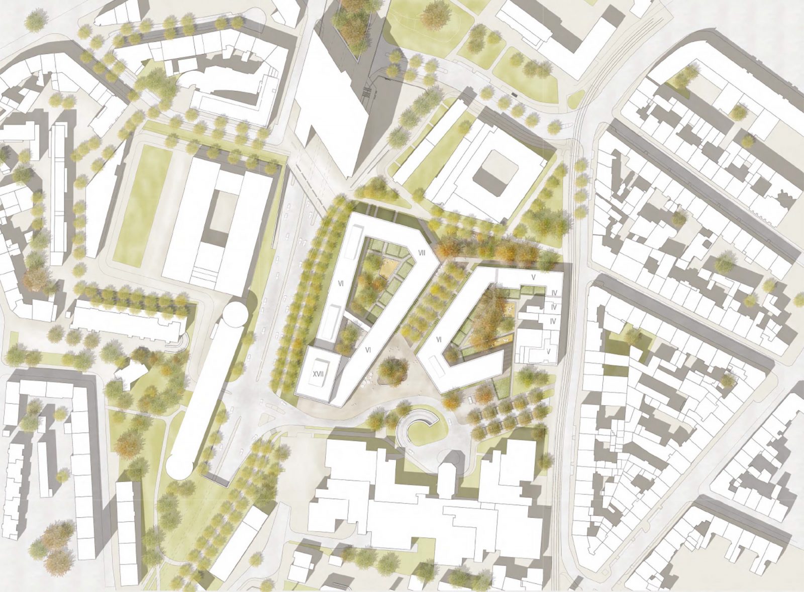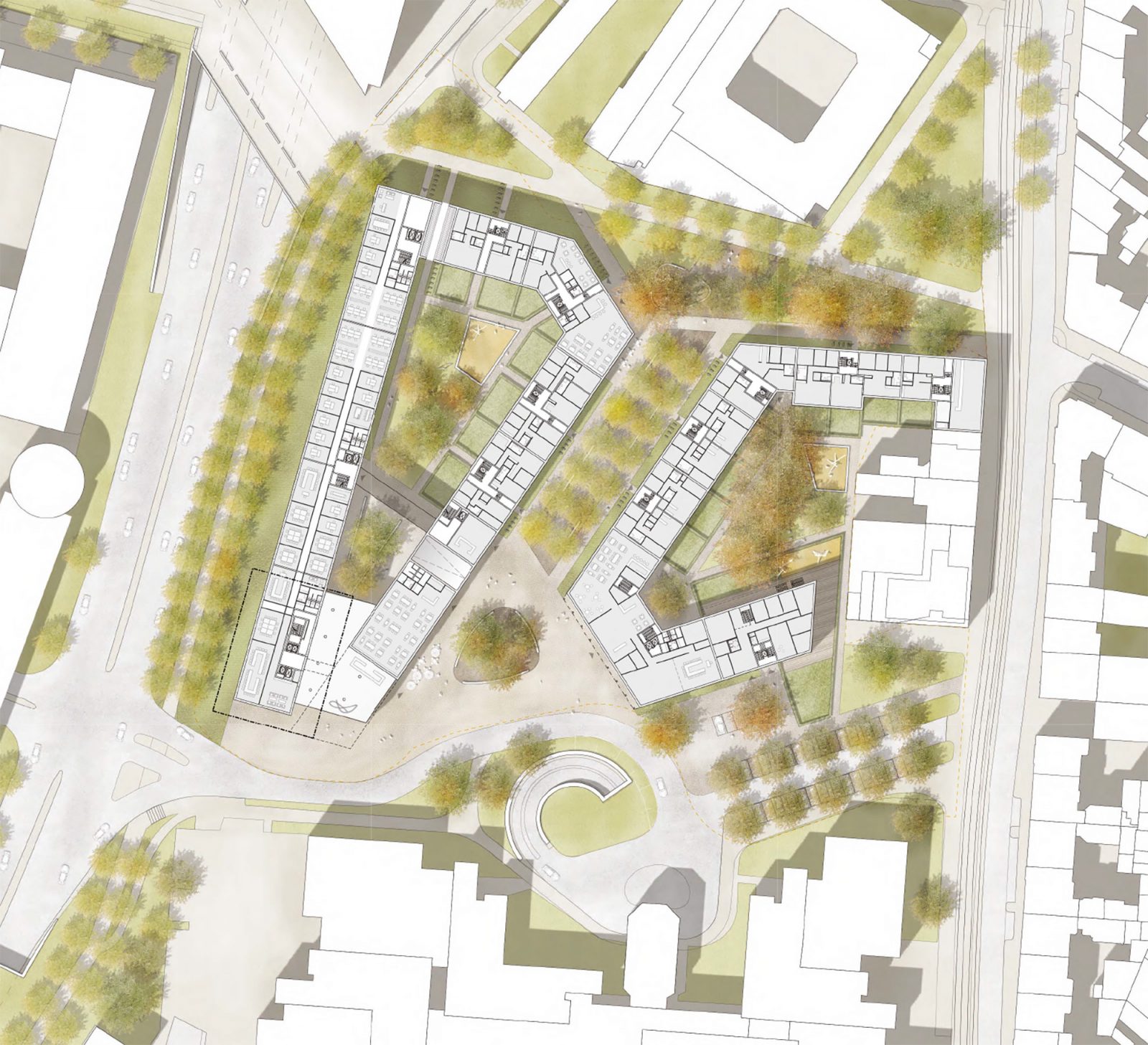 Zwei städtische Blöcke nehmen zuerst die sich ergebenden Baufluchten der umgebenden Straßen auf. Im Süden wird ein städtischer Raum geprägt, an dem sich alle öffentlichen Nutzungen befinden. Im Norden bietet der übergeordnete Grünzug des Lahnweges die Chance ein durchgrüntes Wohnquartier zu schaffen. Verbindendes Element der beiden Bereiche ist der zentral gelegene Wohnboulevard.