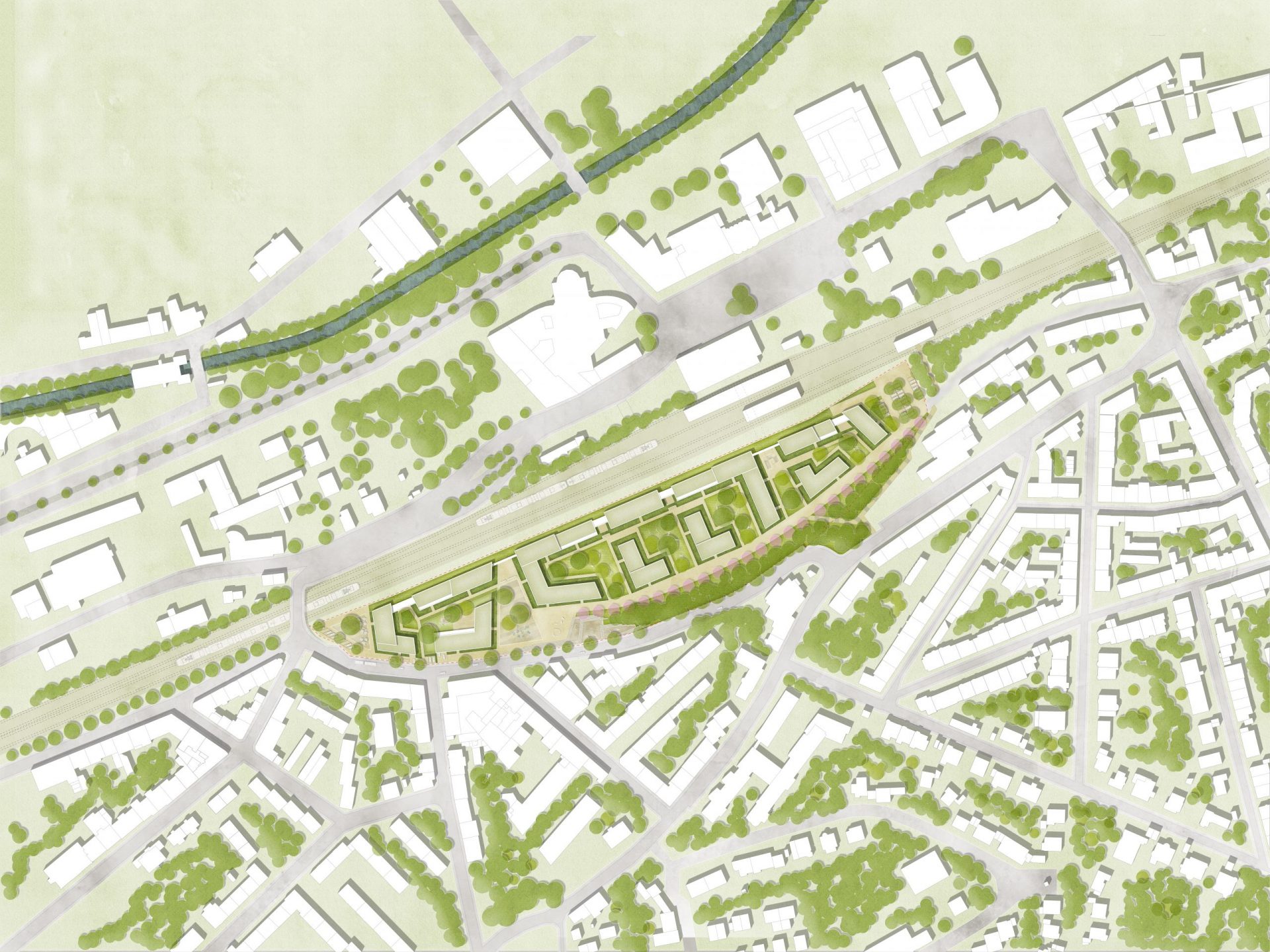 Die Fläche wird, in Anlehnung an die städtebauliche Körnigkeit des Umfeldes, mit drei geöffneten Blöcken mit jeweils unterschiedlichen Charakteren strukturiert. Entlang der Bahnlinie wird die Flucht der benachbarten Strukturen aufgenommen. Zwei verglaste, städtebaulichen Fugen mit Ausrichtung zum Opernhaus, Engelsgarten und zum Barmer Bahnhof schaffen eine visuelle Verbindung zum nördlich der Bahngleise gelegenen Teil Barmens.
