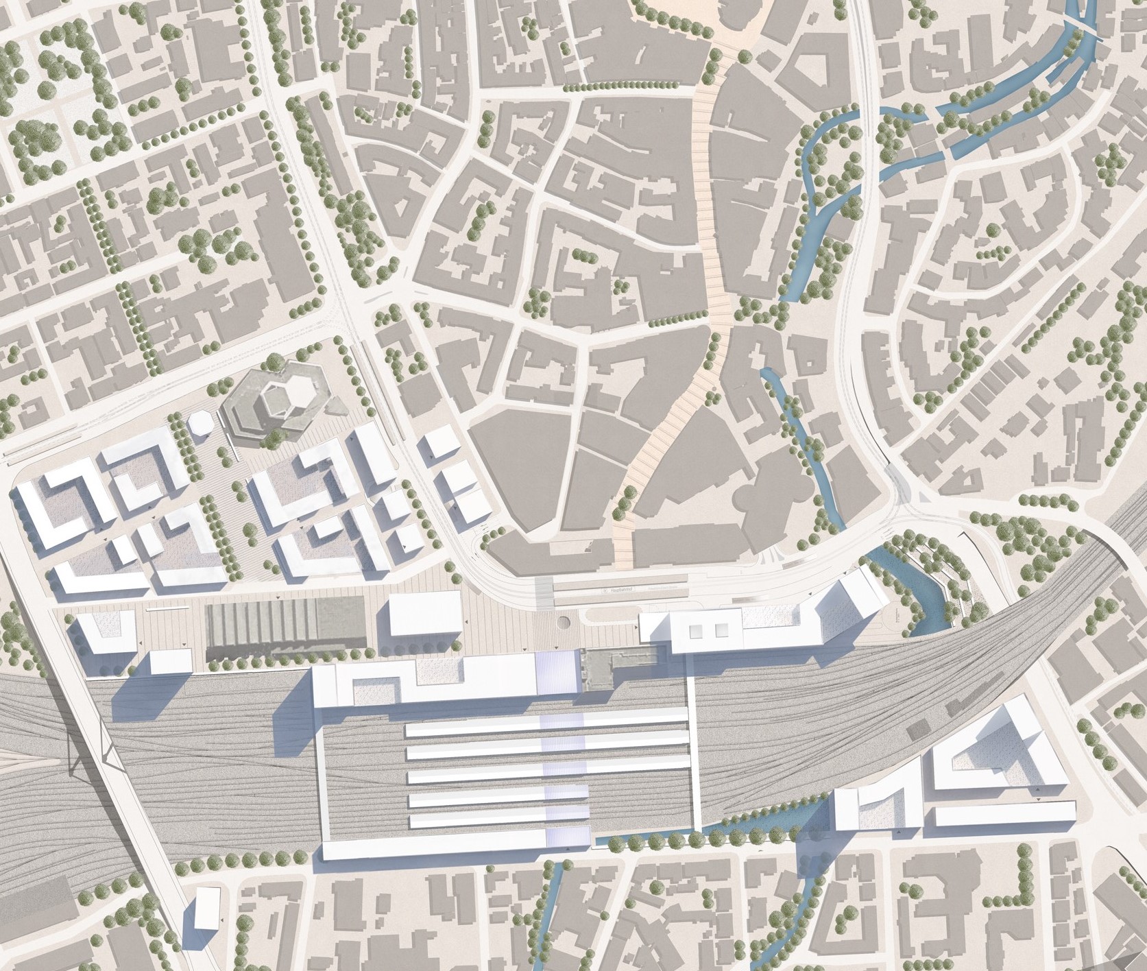Prägend für das Areal des Bahnhofsvorplatzes wird die neue Interpretation des ehemaligen Postbahnhofs als Hochschulcampus sein. Die platzräumliche Verbindung dieses Campus mit dem Theater verknüpft das gesamte Viertel mit dem Bahnhof und schafft die Ausgangsbasis für einen neuen lebendigen Stadtteil.