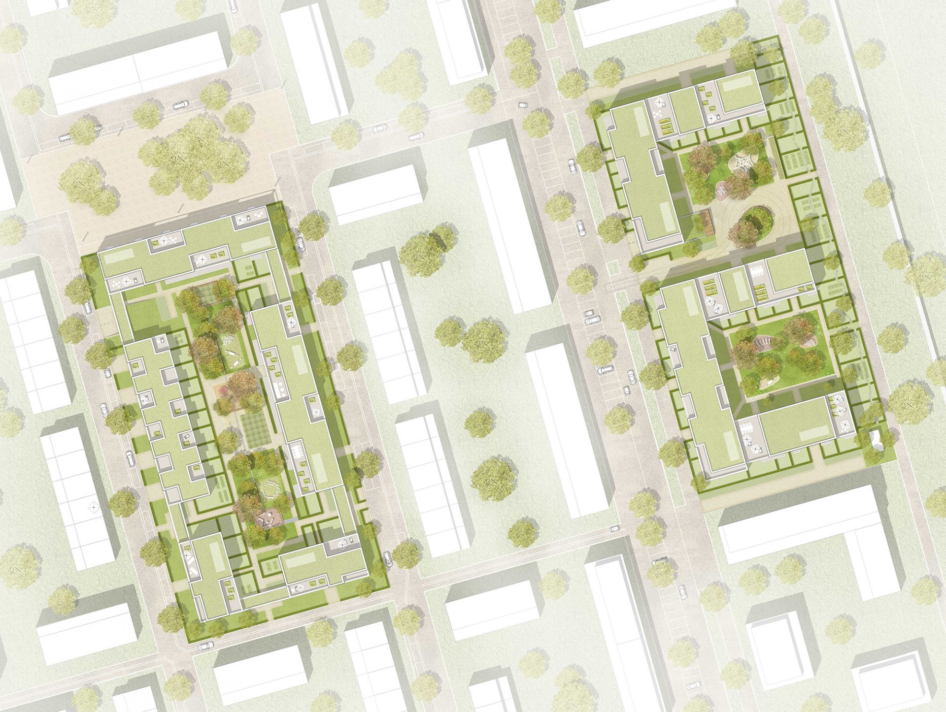 Mit den beiden neuen Quartieren an der 6-Seen-Platte in Duisburg werden attraktive Freiräume geschaffen. Es gilt, in Anlehnung an die Gartenstadt, vielfältig nutzbare Gartenhöfe zu entwickeln, die allen Bewohner*innen zur Verfügung stehen und das Zentrum des nachbarschaftlichen Lebens bilden.
