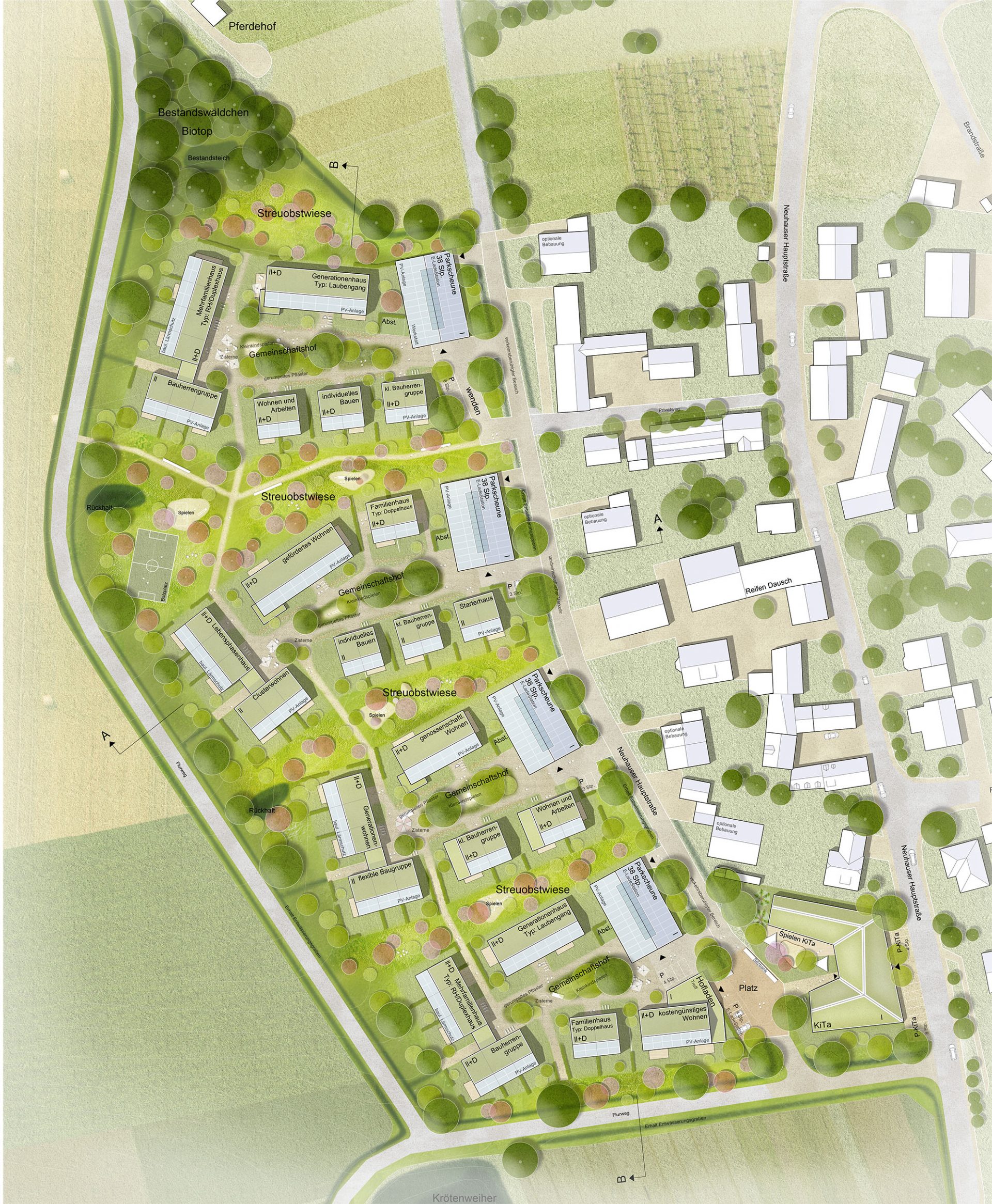 Durch die verdichtete Bauweise gelingt es, dass sowohl der Obstbaumbestand als auch die Biotop- und Waldfläche erhalten und sogar erweitert werden können. Diese „Wildnis nebenan“ aus Wald, Wiesen und landwirtschaftlichen Nutzflächen bleibt bis an den heutigen Ortsrand auch zukünftig erlebbar. Kinder nutzen die Freiflächen als naturnahen Spiel- und Entdeckungsraum.