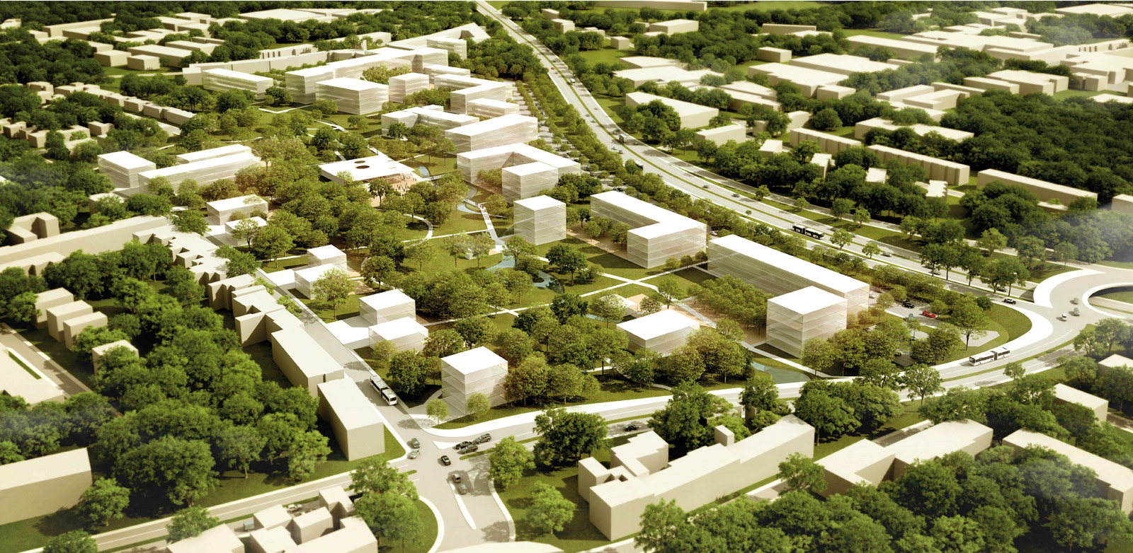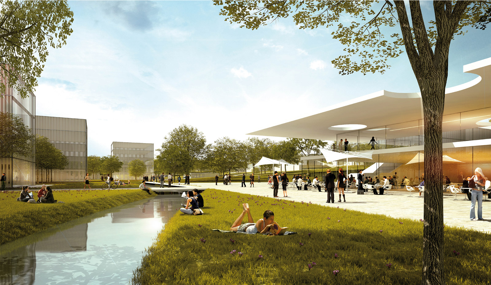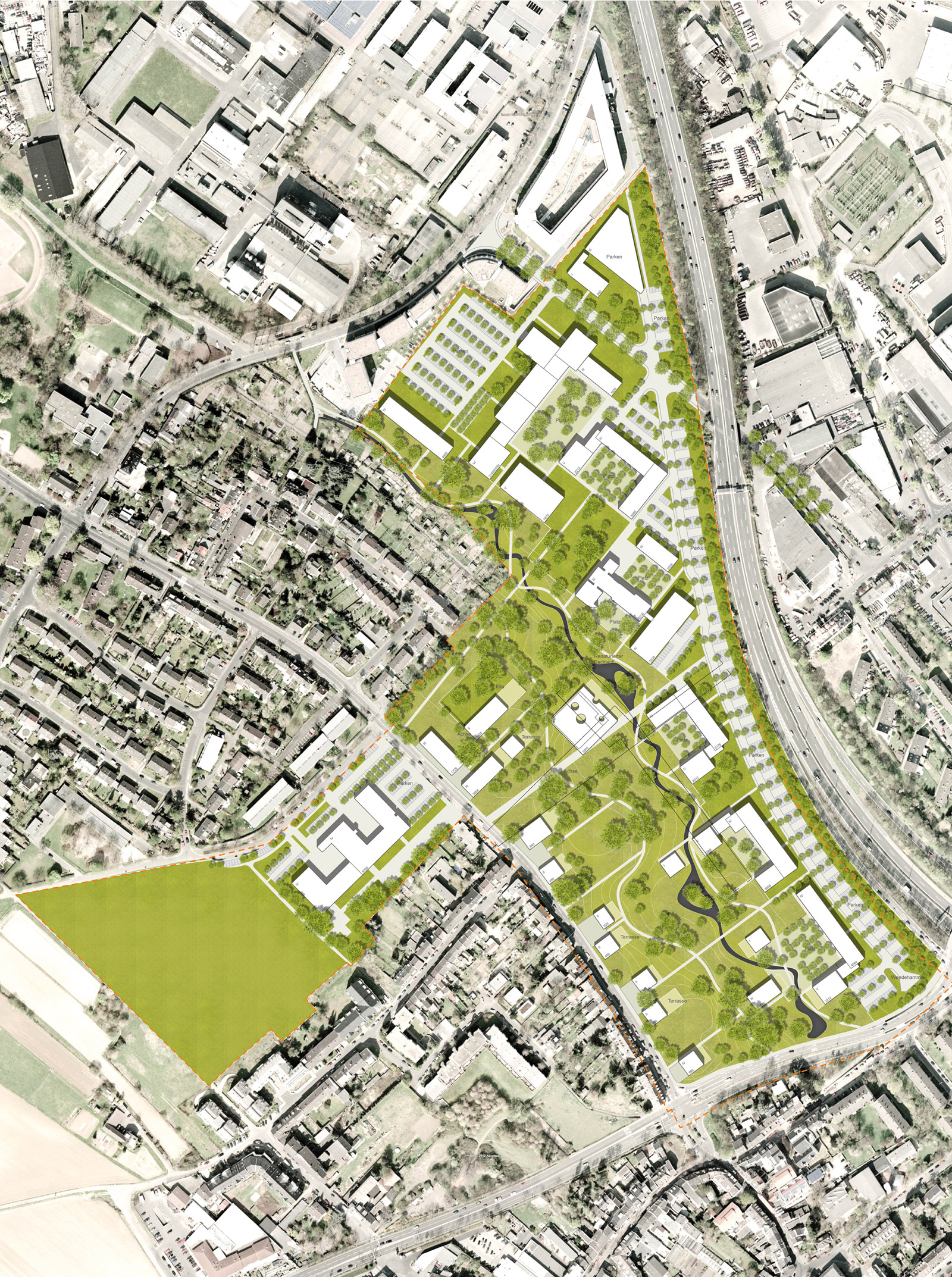 Der gesamte Campus wird geprägt durch seine beeindruckende Topographie. Im Tal, entlang der natürlichen Hangkante mit seinem parkartigen, alten Baumbestand entwickelt sich der neue Campus. Zusammen mit dem neuen Endenicher Bach entsteht ein neues, grünes Lernumfeld. Innerhalb des Grünzuges verbindet ein Wegenetz die einzelnen Institute. Die Mensa liegt zentral inmitten des Parks, die große Terrasse ordnet sich zum Gewässer hin an. Der schöne, alte Baumbestand und insbesondere die Naturdenkmäler bleiben erhalten.