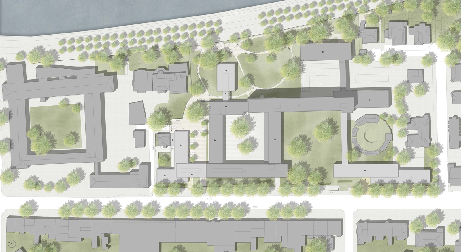 Die parkartigen Strukturen am Rhein werden weiterentwickelt und schließen an die Villenstruktur mit seinen Freiraumstrukturen an. Geschwungene Wege durchziehen die Rasenlandschaft und laden zum Spazieren ein. Großzügige Parkbänke, geschützt durch Hecken und Blütensträucher, bieten viel Platz zum Verweilen und Kommunizieren. Der großzügige Baumbestand bleibt soweit wie möglich erhalten und wird durch einzelne Solitärbäume ergänzt.