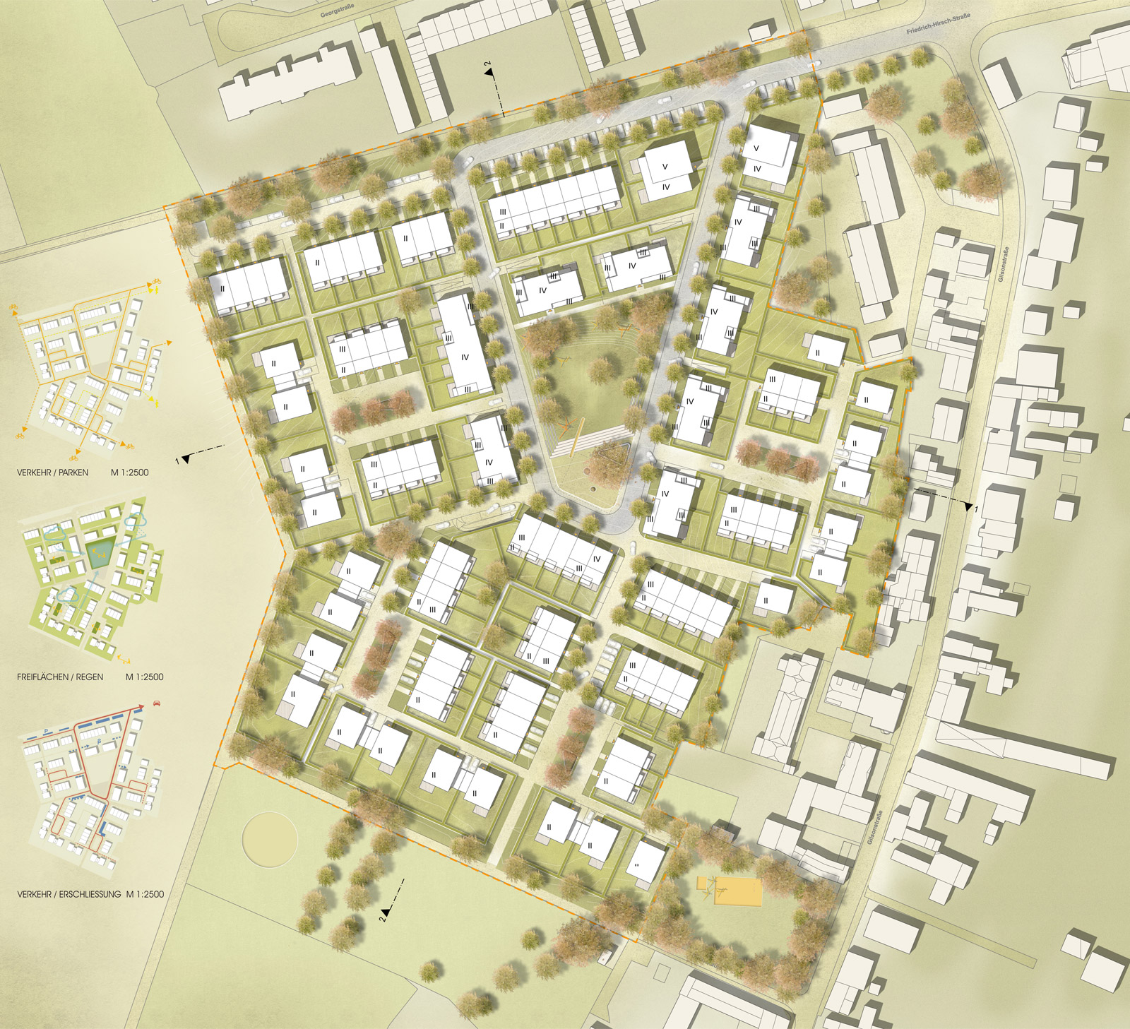 Vier kleinere Quartiersplätze mit Kleinkinderspiel bieten weitere ruhige halböffentliche Räume an. Die Privatgärten werden mit Hecken umschlossen, rückwärtige Mistwege verbinden diese mit dem umgebenen Raum.