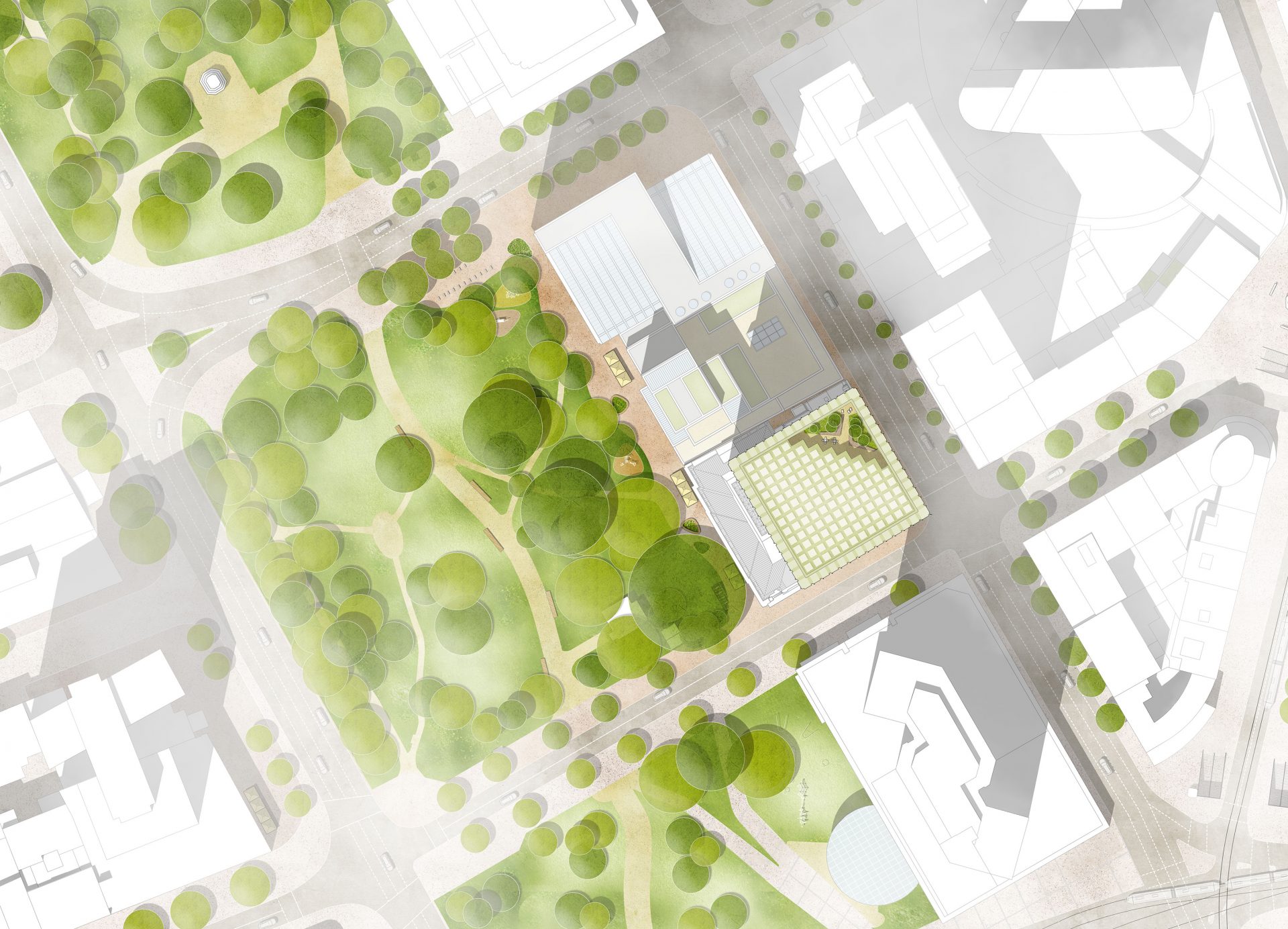 Das Ziel des Entwurfes ist es, eine bessere Verbindung zwischen der Promenade und dem angrenzenden Park im Westen zu schaffen. Durch die Öffnung der bestehenden Wallanlage wird das Gebäudeensemble mit der Grünanlage vernetzt.