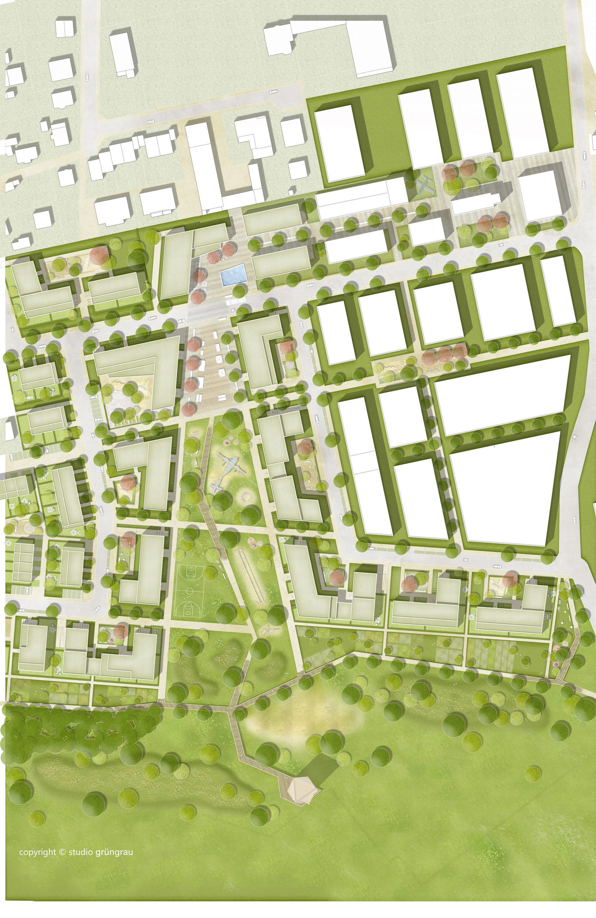 Durch die Gliederung der Wohnbebauung um den zentralen Grünraum, wird das Thema fortgesetzt. Die Einzelnen Gebäudeblöcke bekommen einen gemeinschaftlichen Freiraum mit Spiel- und Aufenthaltsflächen sowie private Gartenflächen. Der versiegelte Flächenanteil wird durch die starke Durchgrünung verringert.