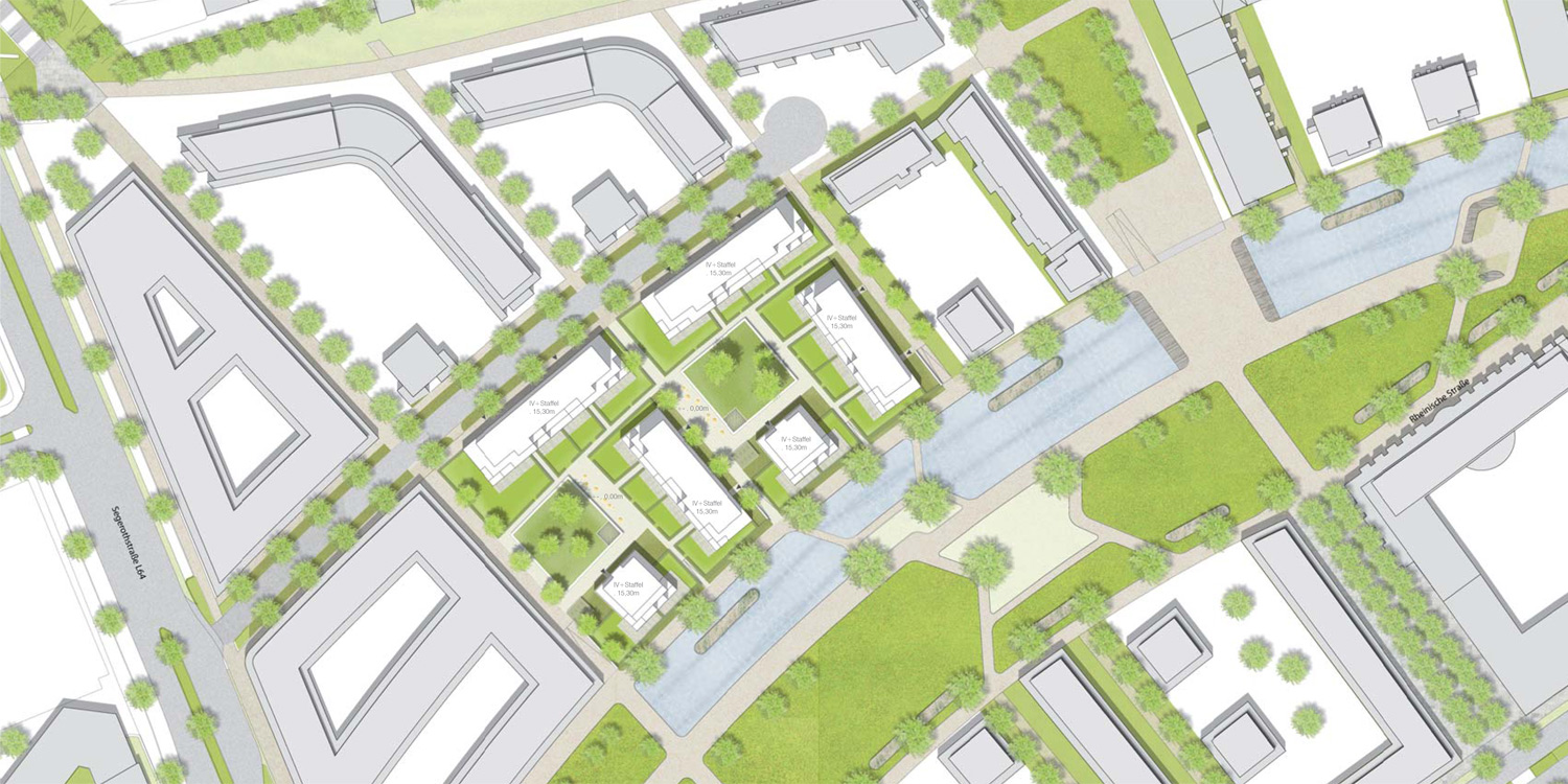 Im Zentrum des freiraumplanerischen Entwurfs steht eine atmosphärische „Insellandschaft“. Freie Formen mit abwechselnder Ausprägung ziehen sich wie an einer Perlenkette aufgereiht durch den Freiraum. Bespielt mit verschieden Themen wie Entspannung, Kommunikation, Spiel und Sport und durch vielfältige Bepflanzung, beleben die „Inseln“ das Gebiet. Locker eingestreute Bänke laden zum Verweilen ein.