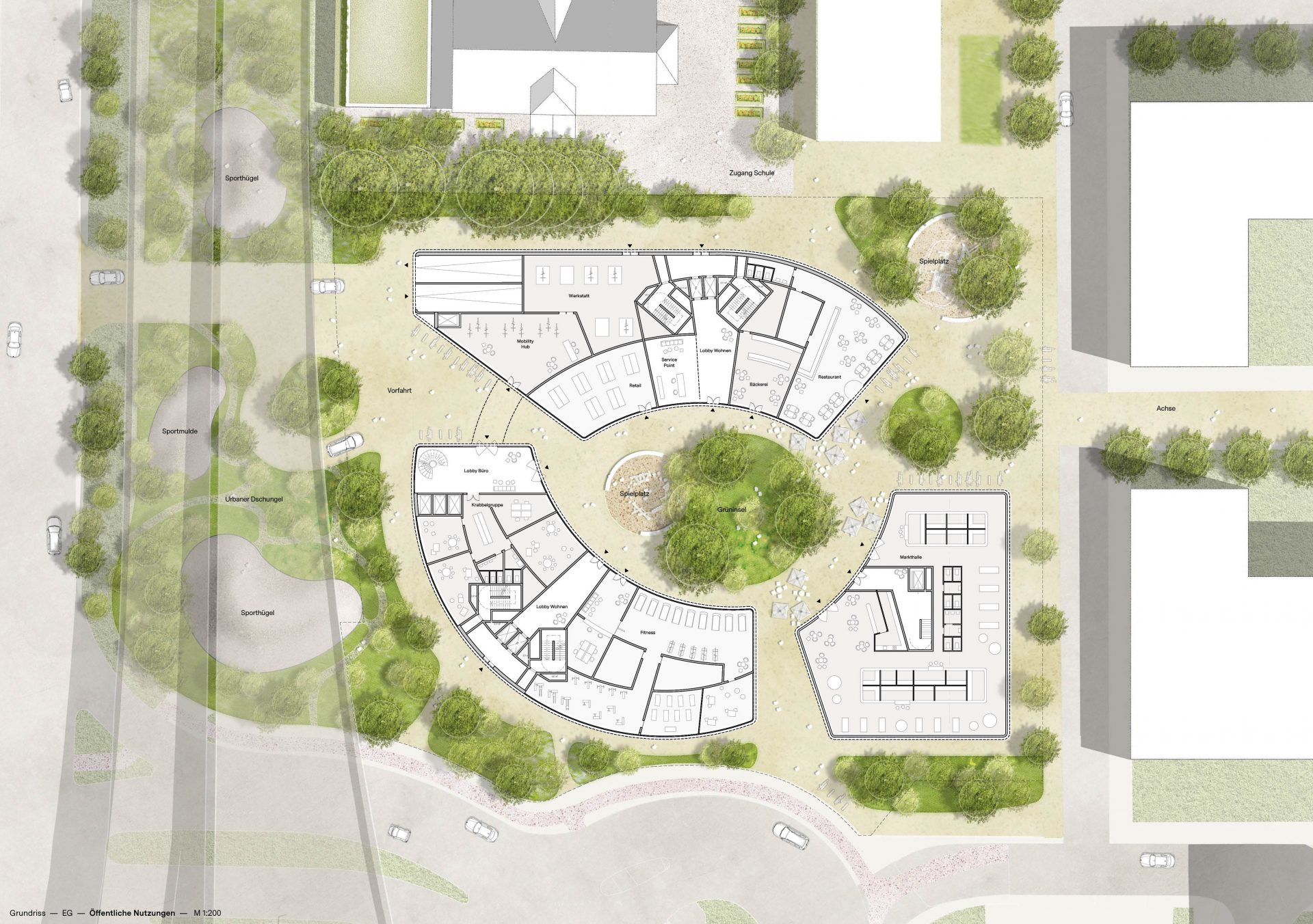 Zentrales Element im Erdgeschoss ist der Hof als Treff- und Aufenthaltsschwerpunkt. Kreisförmige Wiesenflächen wechseln sich hier mit Spielplätzflächen ab.