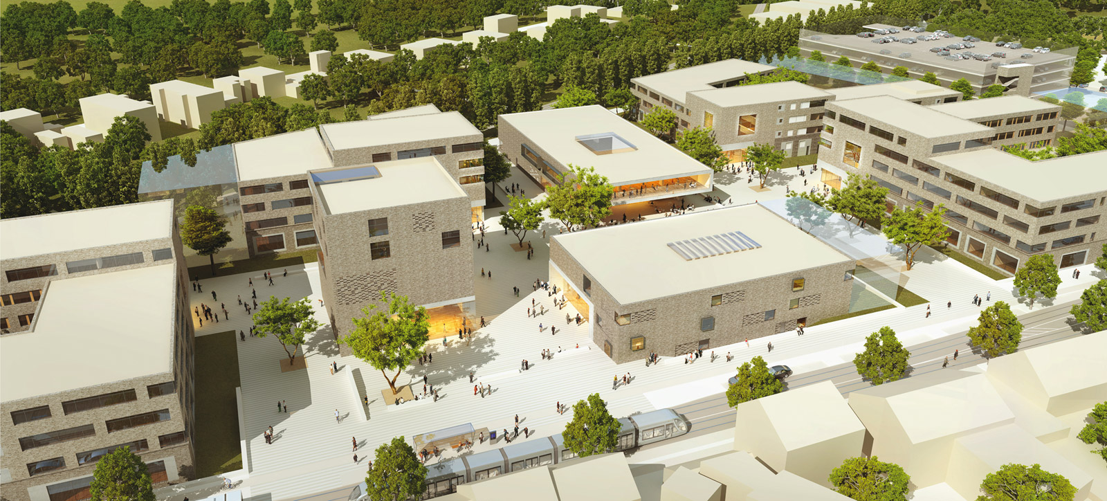 Baumreihen aus Ahorn und Eschen betonen die Zugangswege entlang der Gebäude auf dem Forumsplatz. Entlang der einzelnen Gebäude schaffen pflegeextensive Pflanzflächen aus Gräsern und Stauden Distanz.