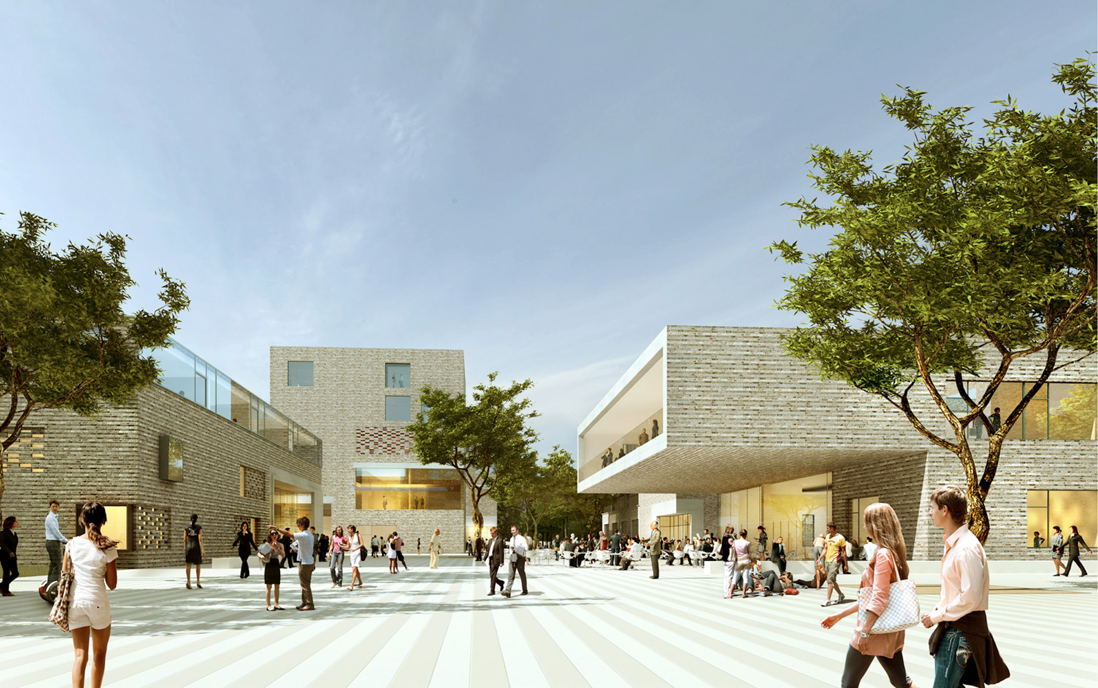 Alle vier Fachbereiche definieren dabei mit ihren Adressen eigenständig die Platzränder. Der Platz wird locker mit Goldgleditschien überstellt. Großzügige Sitzplatzangebote in Form von lang gestreckten Betonbänken auf dem Platz sind Orte der Kommunikation.