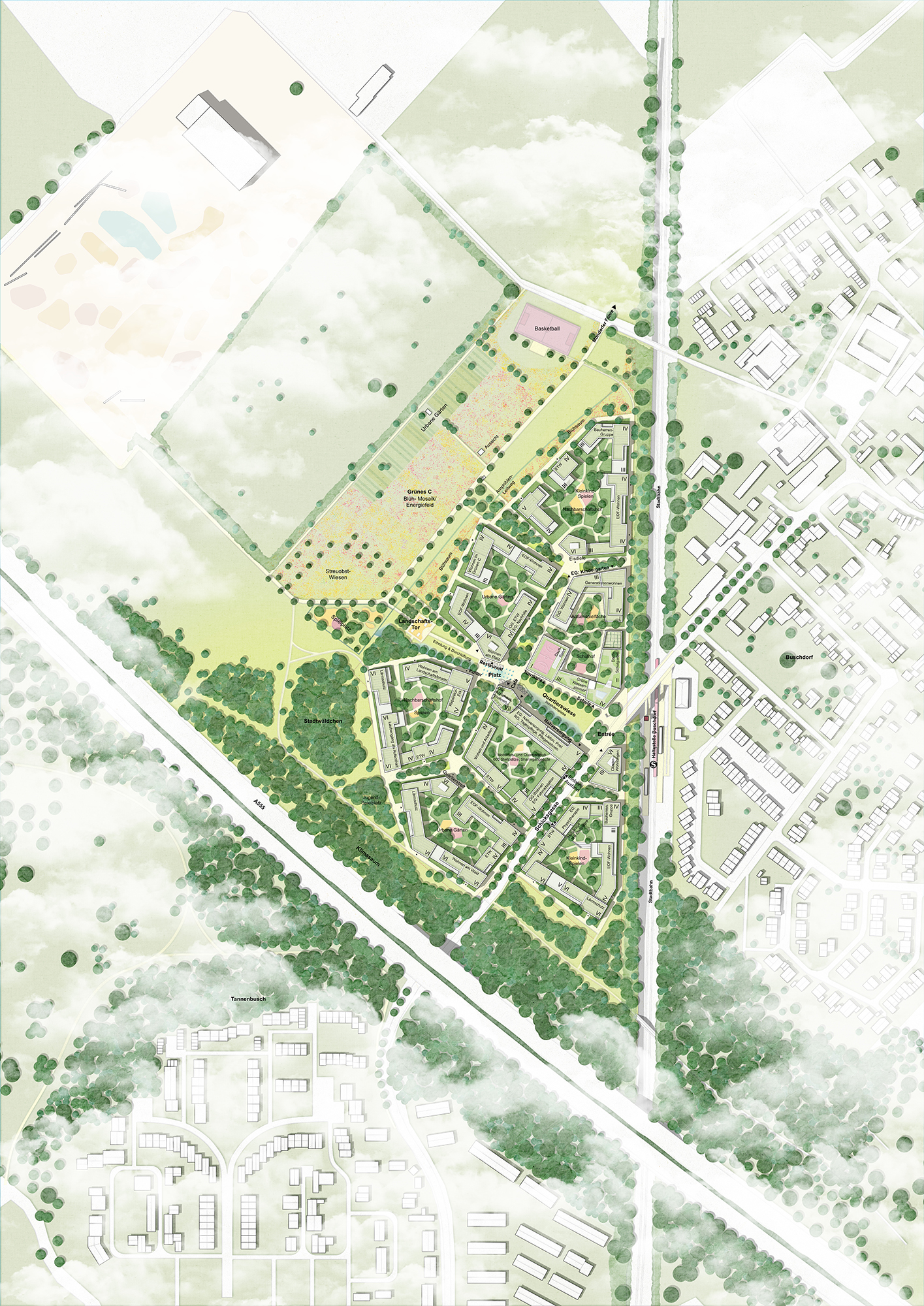 Die Grundstruktur des Gebietes wird durch die Landschaft und die Kulturgeschichte des Ortes definiert. Infrastrukturen der Mobilität, weite Feldstrukturen, dichte Gehölzbestände sowie das Grüne C haben uns inspiriert. Aus der Verbindung bestehender Strukturen und neuer Grün- und Stadträume entsteht eine neue Identität.